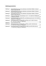 Abbildungsverzeichnis Abbildung 1: Gartenabfallverbrennung in den Landkreisen und kreisfreien Städten in Sachsen- Anhalt mit Stand Mai 2006........................................................................................... 18 Abbildung 2: Gartenabfallverbrennung in den Landkreisen und kreisfreien Städten in Sachsen- Anhalt mit Stand August 2008 ..................................................................................... 19 Abbildung 3: Gartenabfallverbrennung in den Landkreisen und kreisfreien Städten in Sachsen- Anhalt mit Stand April 2011 ......................................................................................... 21 Abbildung 4: Verlauf der Partikel PM10-Konzentrationen vom 01.- 04.10.2003 (0,5-h-Mittelwerte) in Magdeburg-Stadtfeld ............................................................................................... 22 Abbildung 5: : Konzentrationsverlauf von Partikel PM10 und Kohlenmonoxid vom 26.- 28.10.2004 in Hettstedt (0,5-h-Mittelwerte) ........................................................................................ 23 Abbildung 6: Konzentrationsverlauf von Partikel PM10 und PM2,5 vom 31.10.08 (12 Uhr) bis 02.11.08 (0 Uhr) in Burg (0,5-h-Mittelwerte) ................................................................ 24 Abbildung 7: Lage der Messstation Burg.......................................................................................... 25 Abbildung 8: Konzentrationsverlauf von Partikel PM10 und PM2,5 vom 29.11.08 (0 Uhr) bis 01.12.08 (0 Uhr) in Burg (0,5-h-Mittelwerte) ................................................................ 26 Abbildung 9: Konzentrationsverlauf von Partikel PM10 und PM2.5 vom 09.10.09 (0 Uhr) bis 11.10.09 (0 Uhr) in Burg (0,5-h-Mittelwerte) ................................................................ 26