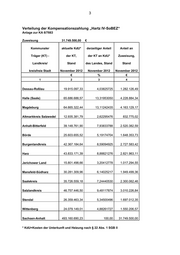 Landtag von Sachsen-Anhalt Drucksache 6/1643 28.11.2012 Antwort der Landesregierung auf eine Kleine Anfrage zur schrift- lichen Beantwortung Abgeordneter Swen Knöchel (DIE LINKE) Nachtragshaushalt 2012: Kompensationszahlungen an Kommunen Kleine Anfrage - KA 6/7663 Vorbemerkung des Fragestellenden: Mit dem Nachtragshaushalt für das Jahr 2012 wurden im Einzelplan 13, Kapi- tel 13 12 Titel 633 06 einmalige Zuweisungen zum Ausgleich von Mindereinnahmen beschlossen. Antwort der Landesregierung erstellt vom Ministerium für Arbeit und Soziales Vorbemerkung: Das Land erhält nach § 11 Abs. 3a des Gesetzes über den Finanzausgleich zwi- schen Bund und Ländern (Finanzausgleichsgesetz - FAG) seit dem Jahr 2012 gerin- gere Sonderbedarfs-Bundesergänzungszuweisungen zum Ausgleich von Sonderlas- ten durch die strukturelle Arbeitslosigkeit und der daraus entstehenden überpropor- tionalen Lasten bei der Zusammenführung von Arbeitslosenhilfe und Sozialhilfe für Erwerbsfähige (sog. „Hartz IV“-SoBEZ). Die in der Vorbemerkung des Fragestellers genannte Zuweisung, die sich auf 31.749.500 Euro beläuft, trägt diesem Rückgang Rechnung. Frage Nr. 1 Wie hoch ist der Anteil jedes Landkreises und jeder kreisfreien Stadt an den be- schlossenen Kompensationszahlungen absolut und relativ? (Ausgegeben am 28.11.2012)