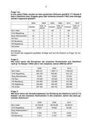 4 Frage 1.e): In wie vielen Fällen wurden im oben genannten Zeitraum gemäß § 111 Absatz 8 Satz 4 Gebühren bzw. Entgelte ganz oder teilweise erlassen? Wie viele Anträge wurden insgesamt gestellt? 2008 2008 2009 2009 2010 2010 teilw. er- teilw. er- teilw. er- erlassen erlassen erlassen lassen lassen lassen MLU Halle 142 0 145 0 199 0 OvG Magdeburg 1 0 2 0 0 0 Burg Giebichenstein 43 0 27 0 46 0 HS Harz 0 0 0 0 0 0 HS Merseburg 0 0 0 0 0 0 HS Magdeburg 0 0 0 0 0 0 HS Anhalt 0 0 0 0 0 0 Anmerkung: Zur Anzahl der insgesamt gestellten Anträge wird auf die Antwort zu Frage 1d) ver- wiesen. Frage 2.: Wie hoch waren die Einnahmen der einzelnen Hochschulen aus Gebühren nach § 112 Absatz 1 HSG LSA in den einzelnen Jahren 2008 bis 2010? 2008 2009 2010 MLU Halle 985.027 1.098.111 1.246.457 OvG Magdeburg 363.749 405.961 522.123 Burg Giebchenstein 15.000 18.000 22.450 HS Harz 176.000 155.400 142.100 HS Merseburg 184.506 150.589 161.394 HS Magdeburg 424.600 308.300 504.900 HS Anhalt 397.355 446.100 506.654 Frage 3: Wie hoch waren die Verwaltungskosten zur Erhebung der Gebühren nach § 112 Absatz 1 an den einzelnen Hochschulen in den einzelnen Jahren des oben ge- nannten Zeitraums? 2008 2009 2010 MLU Halle* 64.308,59 58.034,89 64.993,61 OvG Magdeburg 49.651 48.882 48.285 Burg Giebichenstein ** - - - HS Harz 7.540 7.770 8.000 HS Merseburg 7.231 11.031 9.929