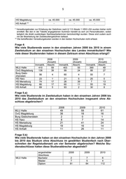 3 bzw. der Kapazität geleistet werden. Demnach sind diese Mittel für den Haushalt rei- ne „Durchlaufposten“. Aus den Mitteln nach § 111 Absatz 3 und 5 wird der Aufwand für Lehrmaterialien (konservativ und online), die Bereitstellung dialogorientierter (E-Learning-Plattformen und die Absicherung zusätzlicher Lehrtätigkeit - gesonderte Lehr- und Prüfungs- durchführung in den lehrveranstaltungsfreien Semesterabschnitten bzw. freitags in der Regel ab 14 Uhr bis samstags 16 Uhr) bestritten. Diese Gebühren und Entgelte werden zu 90 % einnahmeanteilig an die jeweiligen Fachbereiche vergeben (s. o.), die verbleibenden 10 % werden zentral zur Ressour- censicherung in den betroffenen Struktureinheiten (zum Beispiel Abteilung für Stu- dentische Angelegenheiten) eingestellt. Frage 1.c): Welche Einnahmen erzielten die einzelnen Fakultäten und Fachbereiche der Hochschulen von den Studierenden für Studienangebote zur Vertiefung und Ergänzung der beruflichen Praxis, Zweitstudium, Gaststudium (Incl. Prüfungs- gebühren), Lehr- und Lernmittel sowie die Benutzung von Hochschuleinrich- tungen nach § 111 Absatz 3 bis 6 HSG LSA in den einzelnen Jahren 2008 bis 2010? Wie verteilen sich diese Einnahmen auf die einzelnen oben genannten Kategorien? Die Antwort ist der Anlage 2 zu entnehmen. Frage 1.d): In welchen Umfängen wurden im oben genannten Zeitraum die Regelungen in § 111 Absatz 8 Sätze 2 bis 4 HSG LSA genutzt? Jahr Anzahl der Anträge MLU Halle 2008 151 2009 149 2010 202 OvG Magdeburg 2008 163 2009 67 2010 22 Burg Giebichenstein 2008 170 2009 161 2010 187 HS Harz 2008 - 2010 0 HS Merseburg 2008 - 2010 0 HS Magdeburg 2008 - 2010 0 HS Anhalt * 2008 - 2010 *Betreffende Anträge nach § 111 Abs. 8 Satz 4 werden in dezentraler Zuständigkeit beschieden. Eine hochschulbezogene Erfassung bzw. Erhebung erfolgt nicht.
