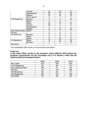 6 Lehramt 34 30 67 Staatsexamen 52 57 48 Magister 24 38 40 Kirchl. Abschl. 0 1 0 OvG Magdeburg Bachelor 5 3 16 Master 2 2 1 Diplom 25 19 34 Lehramt 20 3 9 Staatsexamen 3 4 3 Magister 14 15 26 Burg Giebichenstein Diplom 2 4 3 HS Harz 0 0 0 HS Merseburg Bachelor 0 0 3 Master 0 0 3 Diplom 15 29 21 HS Magdeburg Diplom 12 20 16 Bachelor 5 11 19 HS Anhalt * - - - * Die nachgefragten Daten werden von der Hochschule nicht erfasst. Frage 5.c): In wie vielen Fällen wurden in den einzelnen Jahren 2008 bis 2010 seitens der einzelnen Hochschulen auf der Grundlage von § 112 Absatz 4 HSG LSA die Gebührenpflicht hinausgeschoben? 2008 2009 2010 MLU Halle 310 305 354 OvG Magdeburg 95 89 114 Burg Giebichenstein 105 81 99 HS Harz 141 142 156 HS Merseburg 69 92 70 HS Magdeburg 231 120 149 HS Anhalt 95 88 96