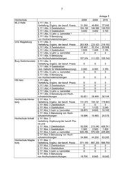 7 Anlage 1 Hochschule 2008 2009 2010 MLU Halle § 111 Abs. 3 Vertiefung, Ergänz. der berufl. Praxis 31.350 46.600 77.050 § 111 Abs. 3 Zweitstudium 154.100 146.960 149.720 § 111 Abs. 4 Gaststudium 3.400 3.400 3.700 § 111 Abs. 5 Lehr- u. Lernmittel * - - - § 111 Abs. 6 Benutzung von Hochschuleinrichtungen * - - - OvG Magdeburg § 111 Abs. 3 Vertiefung, Ergänz. der berufl. Praxis 263.906 223.423 218.192 § 111 Abs. 3 Zweitstudium 55.497 52.134 50.508 § 111 Abs. 4 Gaststudium 1.555 1.400 1.100 § 111 Abs. 5 Lehr- u. Lernmittel 0 0 0 § 111 Abs. 6 Benutzung von Hochschuleinrichtungen 107.914 111.033 105.140 Burg Giebichenstein § 111 Abs. 3 Vertiefung, Ergänz. der berufl. Praxis 0 0 0 § 111 Abs. 4 Gaststudium (incl. Gebühr für Werkstattbenutzung) 2.000 4.300 3.350 § 111 Abs. 5 Lehr- u. Lernmittel 0 0 0 § 111 Abs. 6 Benutzung von Hochschuleinrichtungen 0 0 0 HS Harz § 111 Abs. 3 Vertiefung, Ergänz. der berufl. Praxis 0 0 0 § 111 Abs. 3 Zweitstudium 0 0 0 § 111 Abs. 4 Gaststudium 0 0 0 § 111 Abs. 5 Lehr- u. Lernmittel 0 0 0 § 111 Abs. 6 Benutzung von Hoch- schuleinrichtungen 50.621 28.499 26.104 Hochschule Merse- § 111 Abs. 3 burg Vertiefung, Ergänz. der berufl. Praxis 131.973 159.721 178.645 § 111 Abs. 3 Zweitstudium 0 0 0 § 111 Abs. 4 Gaststudium 0 1.120 2.040 § 111 Abs. 5 Lehr- u. Lernmittel 28.875 9.600 10.100 § 111 Abs. 6 Benutzung von Hoch- schuleinrichtungen 16.996 19.485 24.575 Hochschule Anhalt § 111 Abs. 3 Vertiefung, Ergänzung der berufl. Pra- xis und § 111 Abs. 3 Zweitstudium 92.000 215.543 426.741 § 111 Abs. 4 Gaststudium 1.300 2.500 1.800 § 111 Abs. 5 Lehr- u. Lernmittel 628.250 375.520 425.260 § 111 Abs. 6 Benutzung von Hoch- schuleinrichtungen 54.998 44.200 63.200 Hochschule Magde- § 111 Abs. 3 burg Vertiefung, Ergänz. der berufl. Praxis 571.100 697.200 586.700 § 111 Abs. 3 Zweitstudium 0 0 0 § 111 Abs. 4 Gaststudium 0 0 0 § 111 Abs. 5 Lehr- u. Lernmittel 0 0 0 § 111 Abs. 6 Benutzung von Hochschuleinrichtungen 18.700 8.900 18.000