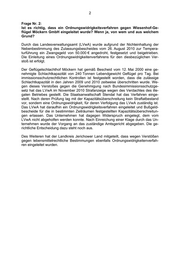 2 Frage Nr. 2: Ist es richtig, dass ein Ordnungswidrigkeitsverfahren gegen Wiesenhof-Ge- flügel Möckern GmbH eingeleitet wurde? Wenn ja, von wem und aus welchem Grund? Durch das Landesverwaltungsamt (LVwA) wurde aufgrund der Nichteinhaltung der Nebenbestimmung des Zulassungsbescheides vom 26. August 2010 zur Tempera- turführung ein Zwangsgeld von 50.000 € angedroht, festgesetzt und beigetrieben. Die Einleitung eines Ordnungswidrigkeitenverfahrens für den diesbezüglichen Ver- stoß ist erfolgt. Der Geflügelschlachthof Möckern hat gemäß Bescheid vom 12. Mai 2000 eine ge- nehmigte Schlachtkapazität von 240 Tonnen Lebendgewicht Geflügel pro Tag. Bei immissionsschutzrechtlichen Kontrollen ist festgestellt worden, dass die zulässige Schlachtkapazität in den Jahren 2009 und 2010 zeitweise überschritten wurde. We- gen dieses Verstoßes gegen die Genehmigung nach Bundesimmissionsschutzge- setz hat das LVwA im November 2010 Strafanzeige wegen des Verdachtes des ille- galen Betriebes gestellt. Die Staatsanwaltschaft Stendal hat das Verfahren einge- stellt. Nach deren Prüfung lag mit der Kapazitätsüberschreitung kein Straftatbestand vor, sondern eine Ordnungswidrigkeit, für deren Verfolgung das LVwA zuständig ist. Das LVwA hat daraufhin ein Ordnungswidrigkeitsverfahren eingeleitet und Bußgeld- bescheide für die in bestimmten Zeiträumen festgestellten Kapazitätsüberschreitun- gen erlassen. Das Unternehmen hat dagegen Widerspruch eingelegt, dem vom LVwA nicht abgeholfen werden konnte. Nach Einreichung einer Klage durch das Un- ternehmen wurde der Vorgang an das zuständige Amtsgericht abgegeben. Die ge- richtliche Entscheidung dazu steht noch aus. Des Weiteren hat der Landkreis Jerichower Land mitgeteilt, dass wegen Verstößen gegen lebensmittelrechtliche Bestimmungen ebenfalls Ordnungswidrigkeitenverfah- ren eingeleitet wurden.