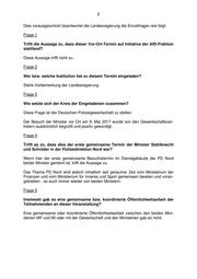 2 Dies vorausgeschickt beantwortet die Landesregierung die Einzelfragen wie folgt: Frage 1 Trifft die Aussage zu, dass dieser Vor-Ort-Termin auf Initiative der AfD-Fraktion stattfand? Diese Aussage trifft nicht zu. Frage 2 Wer bzw. welche Institution hat zu diesem Termin eingeladen? Siehe Vorbemerkung der Landesregierung. Frage 3 Wie setzte sich der Kreis der Eingeladenen zusammen? Diese Frage ist der Deutschen Polizeigewerkschaft zu stellen. Der Besuch der Minister vor Ort am 9. Mai 2017 wurde von den Gewerkschaftsver- tretern ausdrücklich begrüßt und positiv gewürdigt. Frage 4 Trifft es zu, dass dies der erste gemeinsame Termin der Minister Stahlknecht und Schröder in der Polizeidirektion Nord war? Wenn hier der erste gemeinsame Besuchstermin im Dienstgebäude der PD Nord beider Minister gemeint ist, trifft die Aussage zu. Das Thema PD Nord wird jedoch inhaltlich seit geraumer Zeit vom Ministerium der Finanzen und vom Ministerium für Inneres und Sport gemeinsam beraten und voran- getrieben - so auch immer wieder von beiden Ministern. Frage 5 Inwieweit gab es eine gemeinsame bzw. koordinierte Öffentlichkeitsarbeit der Teilnehmenden an dieser Veranstaltung? Eine gemeinsame oder koordinierte Öffentlichkeitsarbeit zwischen den beiden Mini- sterien MF und MI oder mit der Gewerkschaft und den Ministerien gab es nicht.