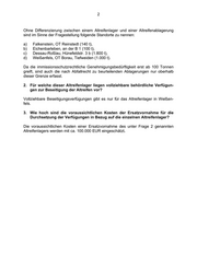 2 Ohne Differenzierung zwischen einem Altreifenlager und einer Altreifenablagerung sind im Sinne der Fragestellung folgende Standorte zu nennen: a) Falkenstein, OT Reinstedt (140 t), b) Eichenbarleben, an der B 1 (100 t), c) Dessau-Roßlau, Hünefeldstr. 3 b (1.800 t), d) Weißenfels, OT Borau, Tiefweiden (1.000 t). Da die immissionsschutzrechtliche Genehmigungsbedürftigkeit erst ab 100 Tonnen greift, sind auch die nach Abfallrecht zu beurteilenden Ablagerungen nur oberhalb dieser Grenze erfasst. 2. Für welche dieser Altreifenlager liegen vollziehbare behördliche Verfügun- gen zur Beseitigung der Altreifen vor? Vollziehbare Beseitigungsverfügungen gibt es nur für das Altreifenlager in Weißen- fels. 3. Wie hoch sind die voraussichtlichen Kosten der Ersatzvornahme für die Durchsetzung der Verfügungen in Bezug auf die einzelnen Altreifenlager? Die voraussichtlichen Kosten einer Ersatzvornahme des unter Frage 2 genannten Altreifenlagers werden mit ca. 100.000 EUR eingeschätzt.
