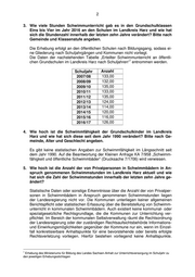 2 3. Wie viele Stunden Schwimmunterricht gab es in den Grundschulklassen Eins bis Vier im Jahr 2016 an den Schulen im Landkreis Harz und wie hat sich die Stundenzahl innerhalb der letzten zehn Jahre verändert? Bitte nach Gemeinde und Klassenstufe angeben. Die Erhebung erfolgt an den öffentlichen Schulen nach Bildungsgang, sodass ei- ne Gliederung nach Schuljahrgängen und Kommunen nicht vorliegt. Die Daten der nachstehenden Tabelle „Erteilter Schwimmunterricht an öffentli- 1 chen Grundschulen im Landkreis Harz nach Schuljahren“ entnommen werden. Schuljahr Anzahl 2007/08 133,00 2008/09 132,00 2009/10 135,00 2010/11 133,00 2011/12 135,00 2012/13 124,00 2013/14 114,00 2014/15 120,00 2015/16 116,00 2016/17 126,00 4. Wie hoch ist die Schwimmfähigkeit der Grundschulkinder im Landkreis Harz und wie hat sich diese seit dem Jahr 1990 verändert? Bitte nach Ge- meinde, Alter und Geschlecht angeben. Es gibt keine statistischen Angaben zur Schwimmfähigkeit im Längsschnitt seit dem Jahr 1990. Auf die Beantwortung der Kleinen Anfrage KA 7/958 „Schwimm- fähigkeit und öffentliche Schwimmbäder“ (Drucksache 7/1706) wird verwiesen. 5. Wie hoch ist die Anzahl der von Privatpersonen in Schwimmbädern in An- spruch genommenen Schwimmstunden im Landkreis Harz aktuell und wie hat sich die Zahl der Schwimmstunden innerhalb der letzten zehn Jahre ge- ändert? Statistische Daten oder sonstige Erkenntnisse über die Anzahl der von Privatper- sonen in Schwimmbädern in Anspruch genommenen Schwimmstunden liegen der Landesregierung nicht vor. Die Kommunen unterliegen keiner allgemeinen Berichtspflicht oder statistischen Erfassung über die Bereitstellung von Schwimm- unterricht in kommunalen Schwimmbädern. Auch existiert keine kommunal- oder spezialgesetzliche Rechtsgrundlage, die die Kommunen zur Unterrichtung ver- pflichtet. Im Bereich der kommunalen Selbstverwaltung räumt die Rechtsordnung der Landesregierung oder der zuständigen Rechtsaufsichtsbehörde Informations- und Einwirkungsmöglichkeiten gegenüber der Kommune nur ein, wenn im Einzel- fall konkretisierbare Anhaltspunkte für eine bevorstehende oder bereits erfolgte Rechtsverletzung vorliegen. Hierfür bestehen vorliegend keine Anhaltspunkte. 1 Erhebung des Ministeriums für Bildung des Landes Sachsen-Anhalt zur Unterrichtsversorgung im Schuljahr zu den jeweiligen Erhebungsstichtagen