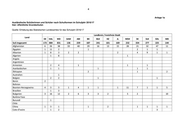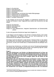 2 Anlage 1a: Grundschulen Anlage 1b: Sekundarschulen Anlage 1c: Gemeinschaftsschulen Anlage 1d: Gymnasien Anlage 1e: Gesamtschulen und Schulen des zweiten Bildungsweges Anlage 1f: Förderschulen für Lernbehinderte Anlage 1g: Förderschulen für Geistigbehinderte Anlage 1h: sonstige Förderschulen In den Anlagen 2a bis 2d sind die Angaben zu ausländischen Schülerinnen und Schülern der Schulen in freier Trägerschaft des Landes nach Schulformen wie folgt erfasst: Anlage 2a: Grundschulen Anlage 2b: Sekundarschulen Anlage 2c: Gymnasien Anlage 2d: Freie Waldorfschulen, Integrierte Gesamtschulen und Gemeinschafts- schulen Zu den nicht genannten Schulformen liegen keine Angaben vor. In der Anlage 3 sind die Angaben zu den Schulen in Sachsen-Anhalt, an der auslän- dische Schülerinnen und Schüler lernen, und der Vom-Hundert-Satz zur Ge- samtschülerzahl der jeweiligen Schule enthalten. Die Anlage 4 gibt eine Übersicht zu jeder Schule in Sachsen-Anhalt, an der staaten- lose Schülerinnen und Schüler sowie Schülerinnen und Schüler mit ungeklärter Her- kunft lernen, und den Vom-Hundert-Satz zur Gesamtschülerzahl der jeweiligen Schu- le. Die Herkunft der Schülerinnen und Schüler wird mit der Schuljahresanfangsstatistik mit Stichtag 23.08. des jeweiligen Jahres erhoben. Die Auswertung liegt der Landes- regierung für das Schuljahr 2017/2018 noch nicht vor. Frage 2: Wie viele Schülerinnen und Schüler mit Migrationshintergrund im Sinne der 1 Definition des BAMF und deutscher Staatsbürgerschaft lernen mit Beginn des Schuljahres 2017/2018 an den Schulen in Sachsen-Anhalt? Sollten die Zahlen zum Schuljahr 2017/2018 noch nicht vorliegen, geben Sie die Zahlen für das Schuljahr 2016/2017 an. Bitte gliedern Sie nach öffentlichen Schulen und Schulen in freier Trägerschaft (sollten für Schulen in freier Trägerschaft keine Zahlen vorliegen, geben Sie nur die Zahlen für öffentliche Schulen an) sowie nach Schulformen und Land- kreisen bzw. kreisfreien Städten. Gliedern Sie darüber hinaus die Gesamtzahl der erfragten Schülerinnen und Schüler nach der jeweiligen Anzahl aus den einzelnen Herkunftsländern. Geben Sie für jede Schule in Sachsen-Anhalt, an der Schülerinnen und Schüler mit Migrationshintergrund aber mit deutscher 1 „Eine Person hat dann einen Migrationshintergrund, wenn sie selbst oder mindestens ein Elternteil nicht mit deutscher Staatsangehörigkeit geboren ist."