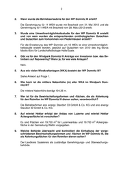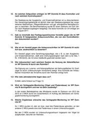 2 2. Wann wurde die Betriebserlaubnis für den WP Domnitz III erteilt? Die Genehmigung für 11 WEA wurde mit Bescheid vom 31. Mai 2012 und die Genehmigung für 1 WEA mit Bescheid vom 28. März 2012 erteilt. 3. Wurde eine Umweltverträglichkeitsstudie für den WP Domnitz III erstellt und von wem wurden die entsprechenden ornithologischen Gutachten und Gutachten zum Vorkommen von Fledermäusen erstellt? Für die Erweiterung des WP Domnitz um 12 WEA ist eine Umweltverträglich- keitsstudie erstellt worden, gestützt auf Gutachten von 2010 des Ing.-Büros Myotis-Büro für Landschaftsökologie Halle/Saale. 4. Gibt es für den Windpark Domnitz III Anträge von Investoren bzw. des Be- treibers auf Repowering? Wenn ja, für wie viele Anlagen? Nein. 5. Aus wie vielen Windkraftanlagen (WKA) besteht der WP Domnitz III? Siehe Antwort auf Frage 1. 6. Wie hoch ist die mittlere Nabenhöhe (m) aller WKA im Windpark Dom- nitz III? Die mittlere Nabenhöhe beträgt 104,35 m. 7. Wer ist für die Bewirtschaftungsformen und -flächen, die als Ablenkung für den Rotmilan im WP Domnitz III dienen sollen, verantwortlich? Die Betreiberfirmen eno energy Standort 33 GmbH & Co. KG und eno energy Standort 32 GmbH & Co. KG. 8. Auf wieviel Hektar erfolgt der Anbau von Luzerne und wieviel Hektar Ackergrasfläche ist vorzuhalten? 2 2 Es sind Flächen von 19.700 m für Luzerneanbau und 19.700 m Ackergras- fläche in der Gemarkung Wettin vorgegeben. 9. Welche Behörde überwacht und kontrolliert die Einhaltung der vorge- schriebenen Bewirtschaftungsformen und -flächen im WP Domnitz III, die als Ablenkungsflächen für den Rotmilan dienen sollen? Der Landkreis Saalekreis als zuständige Genehmigungs- und Überwachungs- behörde.