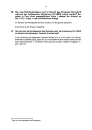 4 16. Wie viele Rotmilanbrutpaare sind im Bereich des Windparks Domnitz III während des landesweiten Monitorings 2012/2013 erfasst wurden? An- gaben in Form einer aussagefähigen Karte - adäquat der Antwort zu Drs. 7/2121, Frage 1 - als nichtöffentliche Anlage. Im Bereich des Windparks Domnitz wurden fünf Brutpaare registriert. * Eine Karte ist als Anlage beigefügt. 17. Wie hat sich der Brutbestand des Rotmilans seit der Kartierung 2012/2013 im Bereich des Windparks Domnitz III entwickelt? Eine Kartierung der besetzten Rotmilan-Horste aus 2015 für einen Teil des be- treffenden Gebietes zeigt, dass die 2012 kartierten Horste wieder besetzt waren oder Wechselhorste in räumlicher Nähe genutzt wurden. Weitere Angaben lie- gen nicht vor. * Karte ist nicht Bestandteil der Drucksache.