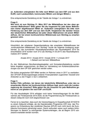 2 an. Außerdem untergliedern Sie bitte nach Mitteln aus dem ESF und aus dem ELER, nach Landesmitteln, kommunalen Mitteln und übrigen Mitteln.) Eine entsprechende Darstellung ist der Tabelle der Anlage 1 zu entnehmen. Frage 2: Wie hoch ist zum Stichtag 31. März 2017 der Mittelabfluss bei den oben ge- nannten Maßnahmen? Bitte geben Sie die insgesamt für jede dieser Maßnah- men bisher abgeflossenen Mittel an. Außerdem untergliedern Sie bitte nach Förderung aus dem ESF und aus dem ELER. Vergleichen Sie darüber hinaus den tatsächlichen Mittelabfluss bei jeder dieser Maßnahmen mit jenem Mittel- abfluss, der bei einem kontinuierlichen Mitteleinsatz zum Stichtag zu erwarten gewesen wäre. Eine entsprechende Darstellung ist der Tabelle der Anlage 2 zu entnehmen. Hinsichtlich der erbetenen Gegenüberstellung des erwarteten Mittelabflusses bei „kontinuierlichem Mitteleinsatz zum Stichtag“ wurde die folgende Auslegung ange- wendet. Zu den kumulierten Haushaltsplanansätzen der Haushaltsjahre 2014 bis einschließlich 2016 wurden noch 3/12 (da Stichtag 31.03.2017) des Haushaltsplana- nsatzes 2017 addiert. Ansatz 2014 + Ansatz 2015 + Ansatz 2016 + ¼ Ansatz 2017 = Zielwert zum bei kont. Mittelabfluss Zu den Maßnahmen Berufseinstiegsbegleiter und Kompetenzfeststellung wurden keine Angaben vorgenommen, da diese zur Vermeidung von Kohärenzüberschnei- dungen aus dem OP ESF gestrichen werden sollen. Die bisher eingeplanten ESF-Mittel werden im Rahmen eines in 2017 zu erarbeiten- den OP-ESF-Änderungsantrages anderen Finanzplaneben zugeordnet. Insoweit sind Antworten zu den Fragen 3. bis 5. entbehrlich. Frage 3: Sollten Fälle auftreten, bei denen der tatsächliche Mittelabfluss unter den zu erwartenden Werten bei kontinuierlichem Abfluss liegt, worin sieht die Landes- regierung die Ursachen? Bitte geben Sie die Ursachen für jede Maßnahme ge- trennt an und gliedern Sie nach ESF und ELER. Für das Haushaltsjahr 2014 erfolgten noch keine Veranschlagungen für die Maß- nahmen der Förderperiode 2014-2020, da die Programmierung der Förderperiode zu diesem Zeitpunkt noch nicht abgeschlossen war. Ferner ist zu beachten, dass auch die Veranschlagung im Doppelhaushalt 2015/2016 zu einem Zeitpunkt erfolgte, als die Operationellen Programme (OP) bzw. das Pro- gramm zur Entwicklung des Ländlichen Raumes (EPLR) noch nicht durch die Euro- päische Kommission genehmigt waren. Damit verbunden waren auch weitere Anfor- derungen im Bereich zu erbringender Systemunterlagen, die ab Beginn 2015 suk- zessive erarbeitet werden konnten.