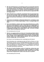 3 3. Wie viele Teilnehmerinnen und Teilnehmer kamen zum genannten Konzert? Aus welchen Landkreisen/kreisfreien Städten Sachsen-Anhalts kamen wie viele Teilnehmerinnen und Teilnehmer und welchen Organisationen waren diese ggf. zuzurechnen? Aus welchen anderen Bundesländern und gege- benenfalls welchen Staaten haben wie viele Personen am genannten Kon- zert teilgenommen? 4. Welche Musikerinnen und Musiker sowie Bands traten bei genanntem Kon- zert auf und aus welchen Orten, Bundesländern und gegebenenfalls Staa- ten kommen diese? Wie schätzt die Landesregierung die jeweilige ideolo- gische und personelle Anbindung an rechte und neonazistische Strukturen ein? 5. Entsprachen die tatsächlich auftretenden Musikerinnen und Musiker sowie Bands auch den im Vorfeld angekündigten? Gab es unangekündigte Auf- tritte? 6. Falls vorab Titellisten und/oder Listen über geplante Musikerinnen und Mu- siker bzw. Bands eingereicht wurden: Traten neben den angekündigten In- terpretinnen und Interpreten auch weitere Musikerinnen und Musiker oder Bands auf oder wurden weitere Titel dargeboten? Hatte dies Konsequenzen in Bezug auf die Auflagen bzw. wurden dadurch ggf. vorhandene Auflagen verletzt? Welche Konsequenzen hatte dies? Die Veranstaltung fand nicht statt. 7. Welches war gegebenenfalls der Anlass der Veranstaltung? Welche Behör- den waren im Vorfeld über die Konzertplanung informiert? Welche behörd- lichen Auflagen wurden gegebenenfalls erteilt und welche sonstigen Maß- nahmen wurden durch welche Behörde ergriffen? Wie wurde die Einhal- tung der Auflagen ggf. vor Ort kontrolliert? Der Anlass für die Veranstaltung ist der Landesregierung nicht bekannt. Nach Informationen der Landesregierung hatte die Polizei im Rahmen von Inter- netrecherchen Kenntnis von der Veranstaltungsplanung erlangt und die zustän- dige Verbandsgemeinde Nordharz informiert. Die Verbandsgemeinde Nordharz setzte den Eigentümer der Räumlichkeiten über die vorgesehene Durchführung einer Musikveranstaltung in Kenntnis. Dieser kündigte daraufhin den mit dem Veranstalter geschlossenen Mietvertrag. 8. Wie viele und welche Straftaten wurden im Vorfeld des, während des oder im Nachgang des genannten Konzertes registriert (Angabe der Paragra- fen)? Falls Gegenstände beschlagnahmt wurden: Welche waren das? Falls Platzverweise ausgesprochen wurden: Wie viele waren es jeweils? Die Veranstaltung fand nicht statt.