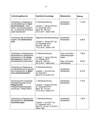5 Tarifvertrag/Branche Rechtliche Grundlage Mindestlohn Betrag Tarifvertrag zur Regelung ei- 6. Rechtsverordnung einheitlicher 11,20 € nes Mindestlohnes im Dach- Mindestlohn deckerhandwerk - Dach-, Laufzeit: 1. Januar 2012 bis Wand- und Abdichtungstech- 31. Dezember 2013 nik - im Gebiet der Bundesre- BAnz. Nr. 196 vom publik Deutschland 29.12.2011 - Seite 4.623 Tarifvertrag über ein Mindest- Allgemeinverbindlicherklärung einheitlicher entgelt in den Elektrohand- Mindestlohn 8,85 € werk Laufzeit: 1. Januar 2011 bis 31. Dezember 2013 BAnz Nr. 189 vom 14.12.2010 - Seite 4.149 Tarifvertrag zur Regelung der 3. Rechtsverordnung Innen- und Unter- 7,56 € Mindestlöhne für gewerbliche haltsreinigungsar- Arbeitnehmer in der Gebäu- Laufzeit: 1. Januar 2012 bis beiten dereinigung im Gebiet der 31. Oktober 2013 Bundesrepublik Deutschland BAnz Nr. 196 vom Glas- und Fassa- 9,00 € 29.12.2011 - Seite 4.621 denreinigung Tarifvertrag zur Regelung ei- 6. Rechtsverordnung nes Mindestlohnes für gewerb- einheitlicher liche Arbeitnehmer im Maler- Laufzeit: 1. Juni 2012 bis Mindestlohn 9,75 € und Lackiererhandwerk 30. April 2013 BAnz AT 31.05.2012 V2 Verordnung über zwingende 1. Rechtsverordnung einheitlicher 7,75 € Arbeitsbedingungen für die Mindestlohn Pflegebranche Laufzeit: 1. August 2010 bis (Pflegearbeitsbedingungen- 31. Dezember 2014 verordnung - Pflege ArbbV) BAnz. Nr. 110 vom 27.07.2010 - Seite 2.571 Tarifvertrag zur Regelung der 1. Rechtsverordnung einheitlicher 7,50 € Mindestlöhne für Sicherheits- Mindestlohn dienstleistungen Laufzeit: 1. Juni 2011 bis 31. Dezember 2013 BAnz Nr. 72 vom 11.05.2011 - Seite 1.692