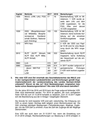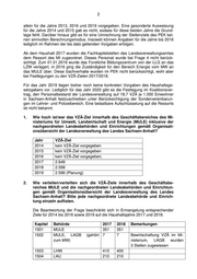 Landtag von Sachsen-Anhalt Drucksache 7/3114 29.06.2018 Antwort der Landesregierung auf eine Kleine Anfrage zur schrift- lichen Beantwortung Abgeordneter Bernhard Daldrup (CDU) Personalsituation innerhalb des Ministeriums für Umwelt, Landwirtschaft und Energie sowie in den nachgeordneten Landesbehörden und Einrichtungen Kleine Anfrage - KA 7/1760 Vorbemerkung des Fragestellenden: Bei der Beantwortung der Fragen bitte darauf achten, dass immer nach den Jahren 2014 bis 2019 (geplant) gefragt ist. Für die bessere Vergleichbarkeit wird eine Um- rechnung von Stellen nach Vollzeitäquivalente (VZÄ) für 2014, 2015 und 2016 erwar- tet. Bitte alle Fragen in tabellarischer Darstellung beantworten. Diese Sachverhalte werden nicht bei jeder Frage erwähnt, sondern durch die Vor- bemerkung als bekannt vorausgesetzt. Antwort der Landesregierung erstellt vom Ministerium für Umwelt, Landwirtschaft und Energie Vorbemerkung der Landesregierung: Die haushaltsrechtlichen Rahmenbedingungen werden durch das parlamentarische Verfahren vorgegeben. Bis 2016 galt für die Personalbewirtschaftung das Personal- entwicklungskonzept (PEK) 2011 - 2025. Die getroffenen Festlegungen fanden sich in den Haushaltsplänen wieder. Der aktuelle Haushalt weist lediglich die VZÄ-Ziele für die Jahre 2017 und 2018 aus. In den Jahren 2014 bis 2016 gab es keine Erfassung in Vollzeitäquivalenten. Die Stellenbewirtschaftung unterlag anderen Regelungen. Die Zielvorgaben für die Stel- lenbewirtschaftung wurden durch das PEK 2011 bis 2025 in Form von Stellenzielen Hinweis: Die Drucksache steht vollständig digital im Internet/Intranet zur Verfügung. Die Anlage ist in Word als Objekt beigefügt und öffnet durch Doppelklick den Acrobat Reader. Bei Bedarf kann Einsichtnahme in der Bibliothek des Landtages von Sachsen-Anhalt er- folgen oder die gedruckte Form abgefordert werden. (Ausgegeben am 02.07.2018)
