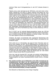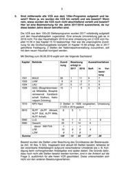 3 Kapitel Behörde 2017 2018 Bemerkungen 1505 MULE, LHW, LAU, FGG 17 16 Bewirtschaftung VZÄ im Mi- Elbe nisterium, 1 VZÄ wurde je- weils dem LAU und dem LHW zugewiesen, für die FGG Elbe sind derzeit 10 VZÄ vorgesehen 1509 GSG (Biosphärenreser- 103 100 Bewirtschaftung VZÄ im Mi- vat Mittelelbe, Biosphä- nisterium, keine konkrete Auf- renreservat Karstland- teilung auf die einzelnen schaft Südharz, National- Großschutzgebiete vorge- park Drömling) nommen 1510 NPV Harz 61 61 2 VZÄ der GSG aus Kapi- tel 15 09 sind für eine Beset- zung durch die NPV vorge- sehen 0910 ÄLFF (ALFF Altmark, 546 533 Bewirtschaftung durch ÄLFF ALFF Süd, ALFF Mitte, insgesamt, keine Aufteilung ALFF Anhalt) der Gesamtzahl auf die ein- zelnen ÄLFF 0960 LLG 315 307 0980 Gesamt 629 614 in 2017 wurden aufgrund or- davon NW FVA 16 16 ganisatorischer Prüfungen LFB 365 357 2 VZÄ nicht konkret zugewie- LZW 247 241 sen 3. Wie viele VZÄ sind Ziel innerhalb des Geschäftsbereiches des MULE und in den nachgeordneten Landesbehörden und Einrichtungen gemäß Orga- nisationsübersicht der Landesverwaltung des Landes Sachsen-Anhalt unbesetzt? Warum ist das so? Sind Neubesetzungen vorgesehen bzw. laufen schon Besetzungsverfahren? Wie viele VZÄ sind davon betroffen? Für die Jahre 2014 bis 2016 und 2019 kann die Frage aufgrund fehlender VZÄ- Ziele nicht beantwortet werden. Für 2018 ist geplant, die noch verfügbaren freien VZÄ bis zum 31.12.2018 komplett zu besetzen. Zum 31.12.2017 ergibt sich die Beantwortung aus der in Anlage 1 beigefügten Übersicht. Die Gründe für nicht besetzte VZÄ sind sehr vielschichtig. Die Erfassung von VZÄ zu einem festen Stichtag stellt lediglich einen Momentzustand dar. Die Zahl unterliegt ständigen Bewegungen (Teilzeitänderungen, Abgänge, Zugän- ge). Um die VZÄ-Zahl zu erhöhen, muss die Zahl der Zugänge die der Abgänge überschreiten. Eine VZÄ war auch dann am 31.12.2017 frei, wenn die Einstellung zum 01.01.2018 erfolgte. Rechtsverpflichtungen zur Besetzung in 2018 erfolgten in
