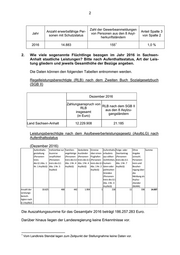 Landtag von Sachsen-Anhalt Drucksache 7/1956 10.10.2017 Antwort der Landesregierung auf eine Kleine Anfrage zur schrift- lichen Beantwortung Abgeordneter Jan Wenzel Schmidt (AfD) Beschäftigungsgrad sogenannter Flüchtlinge Kleine Anfrage - KA 7/1090 Antwort der Landesregierung erstellt vom Ministerium für Arbeit, Soziales und Integration 1. Wie viele sogenannte Flüchtlinge arbeiteten im Jahr 2016 in Sachsen- Anhalt als Beschäftigte oder übten eine selbstständige Tätigkeit aus? Bit- te nach Aufenthaltsstatus gliedern und in Relation zur Gesamtzahl soge- nannter Flüchtlinge setzen. Die Beschäftigtenstatistik der Bundesagentur für Arbeit weist keine Fluchthin- tergründe aus. Deshalb wird alternativ das Aggregat: „Personen mit einer Staatsangehörigkeit aus einem der zugangsstärksten Herkunftsländer von Asylbewerbern“, kurz: „Asylherkunftsländer“, gebildet. Dieses Aggregat umfasst diejenigen nichteuropäischen Länder, die in den letzten Jahren zu den Ländern mit den meisten Asylanträgen gehörten. Dabei handelt es sich um die folgen- den acht Länder: Afghanistan, Eritrea, Irak, Iran, Nigeria, Pakistan, Somalia und Syrien. Die Daten zu den sozialversicherungspflichtig Beschäftigten (svB) aus den acht Asylherkunftsländern zum Stichtag 31.12.2016 können der nachstehenden Ta- belle entnommen werden: Anzahl erwerbsfähige Zahl der svB aus den Anteil Spalte 3 von Stichtag Personen mit Schutzstatus 8 Asylherkunftsländern Spalte 2 31.12.2016 14.883 1.379 9,3 % Hinsichtlich der Zahl der Flüchtlinge, die eine selbstständige Tätigkeit ausüben, liegen der Landesregierung keine Erkenntnisse vor. Es können somit nur die Personen aus den acht Asylzugangsländern ausgewiesen werden, die eine Gewerbeanmeldung besitzen: (Ausgegeben am 10.10.2017)