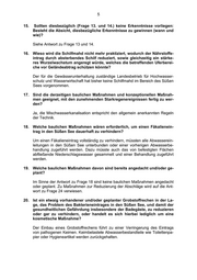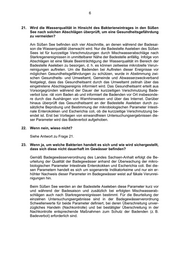 6 21. Wird die Wasserqualität in Hinsicht des Bakterieneintrages in den Süßen See nach solchen Abschlägen überprüft, um eine Gesundheitsgefährdung zu vermeiden? Am Süßen See befinden sich vier Abschnitte, an denen während der Badesai- son die Wasserqualität überwacht wird. Nur die Badestelle Aseleben des Süßen Sees ist für kurzzeitige Verschmutzungen durch Mischwasserabschläge nach Starkregenereignissen in unmittelbarer Nähe der Badestelle anfällig. Infolge von Abschlägen ist eine fäkale Beeinträchtigung der Wasserqualität im Bereich der Badestelle Aseleben zu besorgen, d. h. es können zeitweise mikrobielle Verun- reinigungen auftreten. Um die Badenden bei Auftreten dieser Ereignisse vor möglichen Gesundheitsgefährdungen zu schützen, wurde in Abstimmung zwi- schen Gesundheits- und Umweltamt, Gemeinde und Abwasserzweckverband festgelegt, dass das Gesundheitsamt durch das Umweltamt zeitnah über das eingetretene Abschlagsereignis informiert wird. Das Gesundheitsamt erteilt aus Vorsorgegründen während der Dauer der kurzzeitigen Verschmutzung Bade- verbot bzw. rät vom Baden ab und informiert die Badenden vor Ort insbesonde- re durch das Aushängen von Warnhinweisen und über das Internet. Darüber hinaus überprüft das Gesundheitsamt an der Badestelle Aseleben durch zu- sätzliche Beprobung und Bestimmung der mikrobiologischen Parameter Intesti- nale Enterokokken und Escherichia coli, ob die kurzzeitige Verschmutzung be- endet ist. Erst bei Vorliegen von einwandfreien Untersuchungsergebnissen die- ser Parameter wird das Badeverbot aufgehoben. 22. Wenn nein, wieso nicht? Siehe Antwort zu Frage 21. 23. Wenn ja, um welche Bakterien handelt es sich und wie wird sichergestellt, dass sich diese nicht dauerhaft im Gewässer befinden? Gemäß Badegewässerverordnung des Landes Sachsen-Anhalt erfolgt die Be- urteilung der Qualität der Badegewässer anhand der Überwachung der mikro- biologischen Parameter Intestinale Enterokokken und Escherichia coli. Bei die- sen Parametern handelt es sich um sogenannte Indikatorkeime und nur ein er- höhter Nachweis dieser Parameter im Badegewässer weist auf fäkale Verunrei- nigungen hin. Beim Süßen See werden an der Badestelle Aseleben diese Parameter kurz vor und während der Badesaison und zusätzlich bei erfolgten Mischwasserab- schlägen auch nach Starkregenereignissen bestimmt. Für die Beurteilung der einzelnen Untersuchungsergebnisse sind in der Badegewässerverordnung Schwellenwerte für beide Parameter definiert, bei deren Überschreitung unver- zügliches Handeln (Nachkontrolle) und bei bestätigter Überschreitung in der Nachkontrolle entsprechende Maßnahmen zum Schutz der Badenden (z. B. Badeverbot) erforderlich sind.