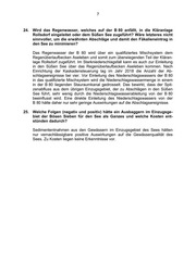 7 24. Wird das Regenwasser, welches auf der B 80 anfällt, in die Kläranlage Rollsdorf eingeleitet oder dem Süßen See zugeführt? Wäre letzteres nicht sinnvoller, um die erwähnten Abschläge und damit den Fäkalieneintrag in den See zu minimieren? Das Regenwasser der B 80 wird über ein qualifiziertes Mischsystem dem Regenüberlaufbecken Aseleben und somit zum überwiegenden Teil der Kläran- lage Rollsdorf zugeführt. Im Starkniederschlagsfall kann es auch zur Einleitung in den Süßen See über das Regenüberlaufbecken Aseleben kommen. Nach Einrichtung der Kaskadensteuerung lag im Jahr 2018 die Anzahl der Ab- schlagsereignisse bei vier. Vor Einleitung des Niederschlagswassers der B 80 in das qualifizierte Mischsystem wird die Niederschlagswassermenge in einem in der B 80 liegenden Stauraumkanal gedrosselt. Das bewirkt, dass der Spit- zenabfluss aus dem übrigen Einzugsgebiet, der zu Abschlägen in den Süßen See führt, sehr wenig durch die Niederschlagswasserableitung von der B 80 beeinflusst wird. Eine direkte Einleitung des Niederschlagswassers von der B 80 hätte daher nur sehr geringe Auswirkungen auf die Abschlagsereignisse. 25. Welche Folgen (negativ und positiv) hätte ein Ausbaggern im Einzugsge- biet der Bösen Sieben für den See als Ganzes und welche Kosten ent- stünden dadurch? Sedimententnahmen aus den Gewässern im Einzugsgebiet des Sees hätten nur vernachlässigbare positive Auswirkungen auf die Gewässerqualität des Sees. Zu Kosten liegen keine Erkenntnisse vor.