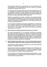 Landtag von Sachsen-Anhalt Drucksache 6/358 01.09.2011 Antwort der Landesregierung auf eine Kleine Anfrage zur schrift- lichen Beantwortung Abgeordnete Eva von Angern (DIE LINKE) Schülergerichte/Schülergremien Kleine Anfrage - KA 6/7150 Vorbemerkung des Fragestellenden: Die Koalitionspartner schrieben in ihrer Koalitionsvereinbarung fest, dass eine räum- liche und inhaltliche Entwicklung des Projekts „Schülergremien“ angestrebt wird. Antwort der Landesregierung erstellt vom Ministerium für Justiz und Gleichstellung 1. Wie viele „Schülerrichterinnen und -richter“ wurden seit Beginn des Pro- jektes in Sachsen-Anhalt ausgebildet? Bitte nach Geschlecht und Alter unterteilen. Das Ministerium der Justiz hat im Jahr 2007 mit der Einrichtung von Schüler- gremien im Land Sachsen-Anhalt begonnen. Das Projekt Schülergremium ver- folgt das Ziel, mit einer Ahndung geringfügiger Delikte Jugendlicher durch ein aus Gleichaltrigen bestehendes Gremium weitere Straftaten des betreffenden Jugendlichen auch in der Zukunft zu verhindern. Die Mitglieder des Gremiums werden bewusst nicht als „Schülerrichter“ bezeichnet, da ihnen keine richterli- chen Aufgaben übertragen sind und sie insbesondere nicht über die Schuldfra- ge zu entscheiden haben. Der Begriff „Schülerrichter“ resultiert aus der Tatsa- che, dass es sich um Jugendliche (i. d. R. zwischen 14 und 17 Jahren) handelt, die aufgrund ihres Alters vorwiegend noch Schulen besuchen (auch berufsbe- zogene Schulen). Die im Gremium tätigen Schüler entscheiden nach einem Gespräch mit den be- troffenen Jugendlichen über angemessene Reaktionen auf deren Verfehlungen (Erbringen von Arbeitsleistungen, schriftliche Reflexionen zur begangenen Tat oder Entschuldigungen bei Tatopfern, künstlerische Auseinandersetzung mit (Ausgegeben am 06.09.2011)