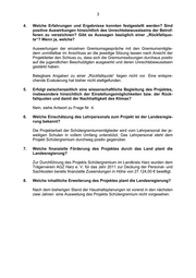 3 4. Welche Erfahrungen und Ergebnisse konnten festgestellt werden? Sind positive Auswirkungen hinsichtlich des Unrechtsbewusstseins der Betrof- fenen zu verzeichnen? Gibt es Aussagen bezüglich einer „Rückfallquo- te“? Wenn ja, welche? Auswertungen der einzelnen Gremiumsgespräche mit den Gremiumsmitglie- dern unmittelbar im Anschluss an die jeweilige Sitzung lassen nach Ansicht der Projektleiter den Schluss zu, dass sich die Gremiumssitzungen durchaus positiv auf die jugendlichen Beschuldigten ausgewirkt und deren Unrechtsbewusstsein gestärkt haben. Belegbare Angaben zu einer „Rückfallquote“ liegen nicht vor. Eine entspre- chende Evaluierung hat bisher nicht stattgefunden. 5. Erfolgt zwischenzeitlich eine wissenschaftliche Begleitung des Projektes, insbesondere hinsichtlich der Einstellungsmöglichkeiten bzw. der Rück- fallquoten und damit der Nachhaltigkeit des Klimas? Nein, siehe Antwort zu Frage Nr. 4. 6. Welche Einschätzung des Lehrpersonals zum Projekt ist der Landesregie- rung bekannt? Die Projektarbeit der Schülergremiumsmitglieder wird vom Lehrpersonal der je- weiligen Schulen in vollem Umfang unterstützt. Das Lehrpersonal steht dem Projekt Schülergremium durchweg positiv gegenüber. 7. Welche finanzielle Förderung des Projektes durch das Land plant die Landesregierung? Zur Durchführung des Projekts Schülergremium im Landkreis Harz wurden dem Trägerverein AGZ Harz e. V. für das Jahr 2011 zur Deckung der Personal- und Sachkosten bereits finanzielle Zuwendungen in Höhe von 27.124,00 € bewilligt. 8. Welche inhaltliche Erweiterung des Projektes plant die Landesregierung? Nach dem bisherigen Stand der Haushaltsplanungen ist vorerst in den nächsten zwei Jahren eine Ausweitung des Projekts Schülergremium nicht vorgesehen.