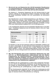 2 1. Wie hat sich das vom Staatsschutz des LKA-SA bearbeitete Fallaufkommen von linksextremistischen, rechtsextremistischen und islamistisch motivier- ten Straftaten im Zeitraum von 2014 über 2015 bis 2016 entwickelt? Die Abteilung 5 - Polizeilicher Staatsschutz des LKA Sachsen-Anhalt ist unter anderem zuständig für die Bearbeitung Politisch motivierter Kriminalität (PMK). Die hierbei bearbeiteten Straftaten sind nicht ausschließlich als extremistisch eingestuft. Das Fallaufkommen und die Verfahrensbearbeitung in der Abteilung 5 - Polizei- licher Staatsschutz umfassen neben Straftaten der PMK in den Phänomenbe- reichen Links, Rechts und Islamismus auch politisch motivierte Ausländerkrimi- nalität (PMAK), Straftaten ohne explizit politische Motivation (STOEPM), sonstige PMK sowie Gefahrenabwehrvorgänge (GAV) und Ermittlungsersuchen. In der nachfolgenden Übersicht wird das bearbeitete Fallaufkommen in der Abtei- lung 5 - Polizeilicher Staatsschutz des LKA Sachsen-Anhalt im Sinne der Frage- stellung dargestellt. Phänomenbereich Jahr 2014 2015 2016 PMK-rechts 7 69 100 PMK-links 11 13 32 PMAK/Islamismus 13 23 49 Gesamt 31 105 181 Zu beachten ist, dass die hier genannte Anzahl der bearbeiteten Verfahren sich von denen unterscheidet, die nach definierten Erfassungsregeln dem regelmäßig erstellten Lagebild PMK zu entnehmen sind. In dieser Übersicht sind auch Vor- gänge enthalten, in denen nach staatsanwaltschaftlicher Prüfung keine Straftat vorlag oder sich der Anfangsverdacht einer politischen Motivation nicht bestätig- te. 2. Wie viele Dienstposten gab es beim polizeilichen Staatsschutz des LKA- LSA im o. g. Betrachtungszeitraum, aufgeschlüsselt nach den Bearbei- tungsbereichen der linksextremistischen, rechtsextremistischen und is- lamistisch motivierten Straftaten und inwieweit wurden die bisher vorhan- denen Dienstposten des polizeilichen Staatsschutzes im LKA-SA personell entsprechend an das Fallaufkommen angepasst? Die Mitteilung der der Landesregierung zu dieser Frage vorliegenden Informatio- nen ist in dem für die Öffentlichkeit einsehbaren Teil der Beantwortung der Klei- nen Anfrage aus Geheimhaltungsgründen nicht möglich. Zur Begründung wird auf die Vorbemerkung der Landesregierung zu dieser Kleinen Anfrage verwie- sen. Der als Verschlusssache eingestufte Teil der Antwort der Landesregierung steht den Abgeordneten des Landtages deshalb in der Geheimschutzstelle des Land- tages von Sachsen-Anhalt zur Einsichtnahme zur Verfügung.