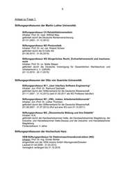 4 Anlage zu Frage 1: Stiftungsprofessuren der Martin Luther Universität: Stiftungsprofessur C4 Rehabilitationsmedizin Inhaber: Prof. Dr. med. Wilfried Mau gefördert durch die Deutsche Rentenversicherung (01.01.2003 - 31.12.2012) Stiftungsprofessur W3 Photovoltaik Inhaber: Prof. Dr. rer. nat. Roland Scheer gefördert durch die Q-Cells AG (01.06.2010 - 31.05.2015) Stiftungsprofessur W3 Bürgerliches Recht, Zivilverfahrensrecht und Insolvenz- recht Inhaber: Prof. Dr. iur. Malte Stieper gefördert durch die Deutsche Vereinigung für Gewerblichen Rechtsschutz und Urheberrecht e. V. (GRUR) (01.12.2010 - 30.11.2015) Stiftungsprofessuren der Otto von Guericke Universität: Stiftungsprofessur W 1 „User Interface Software Engineering“ Inhaber: Jun.-Prof. Dr. Raimund Dachselt gefördert durch den Stifterverband für die Deutsche Wissenschaft (01.11.2007 - 31.10.2013) (seit 01.04.2011 als W2 Professor berufen) Stiftungsprofessur W1 „VWL, insbes. Arbeitsmarktökonomik“ Inhaber: Jun.-Prof. Dr. Lothar Thomsen gefördert durch den Stifterverband für die Deutsche Wissenschaft (01.08.2007 - 31.07.2013) (Ruf auf eine W3 zum 01.10.2011) Stiftungsprofessur W2 „Ökonomische Bildung und ihre Didaktik“ Inhaber: N.N. gefördert durch die Handwerkskammer Halle, die Handwerkskammer Magdeburg, der Industrie- und Handelskammer Halle-Dessau und der Industrie- und Handelskammer Magdeburg Förderzeitraum: 5 Jahre Stiftungsprofessuren der Hochschule Harz: VEM-Stiftungsprofessur für Elektromaschinenekonstruktion (W2) Inhaber: Prof. Dr.-Ing. Günter Bühler eingerichtet von der VEM motors GmbH Wernigerode/Dresden Laufzeit 01.04.2008 - 31.03.2012, Vertraglich verlängert bis 31.10.2016