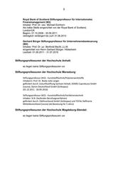 5 Royal Bank of Scotland Stiftungsprofessur für Internationales Finanzmanagement (W2) Inhaber: Prof. Dr. oec. Michael Eichhorn Als halbe Stelle eingerichtet von der Royal Bank of Scotland, London/UK Beginn: 01.10.2008 - 30.09.2011 vertraglich verlängert bis zum 31.08.2013 Gerhard Bürger Stiftungsprofessur für Unternehmensbesteuerung (W2) Inhaber: Prof. Dr. jur. Berthold Becht, LL.M. eingerichtet von Herrn Gerhard Bürger, Hildesheim Laufzeit: 01.08.2011 - 31.07.2016 Stiftungsprofessuren der Hochschule Anhalt: es liegen keine Stiftungsprofessuren vor Stiftungsprofessuren der Hochschule Merseburg: Stiftungsprofessur (W2) - Kunststofftechnik/Polymerwerkstoffe Inhaberin: Prof. Dr. Beate Julia Langer gefördert durch: Zukunftsstiftung Sachsen-Anhalt, DOMO Caproleuna GmbH (Leuna), Styron Deutschland GmbH (Schkopau) (01.10.2011 - 30.09.2016) Stiftungsprofessur (W2) - Kunststofftechnik/Verfahrenstechnik Inhaber: N.N. (laufendes Berufungsverfahren) gefördert durch: Olefinverbund GmbH (Schkopau) und TOTAL Raffinerie Mitteldeutschland (Leuna) (ab Besetzung für 5 Jahre) Stiftungsprofessuren der Hochschule Magdeburg-Stendal: es liegen keine Stiftungsprofessuren vor