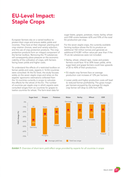 Table 6: Short-term yield and variable cost changes at extrapolated EU level Yield Production Cost Crop Ex-farm Yield WITH Yield Yield Cost WITH Cost Cost price Change WITHOUT Change WITHOUT (€/t) (t/ha) (∆ %) (t/ha) ( €/ha) (∆ €/ha) (€/ha) POTATOES 180 31.5 −20% 25.3 2,599 263 2,862 GRAPES 561 7.4 −24% 5.6 1,728 311 2.039 SUGAR BEET 33 72.1 −36% 46.4 1,259 295 1,555 OSR 427 3.1 −15% 2.7 686 69 755 WHEAT 188 5.6 −16% 4.7 626 39 665 MAIZE 176 7.0 −16% 5.8 895 21 916 BARLEY 183 4.7 −16% 4.0 558 30 588 At the rate of current EU demand for the seven • GHG emissions resulting from the additional staple crops, the loss of the 75 substances will land cultivated in the EU will be 32 million lead to a gap between EU production and EU tonnes of CO2 equivalent. demand. The EU will lose self-sufficiency in all seven staple crops. To continue to meet current levels of demand, the EU can either choose to a) import the EU INCOME EFFECTS crops from abroad or b) convert additional land in the EU for cultivation. Farmers in the different European countries must contend with very different climates, pest pressures a. To continue to meet current levels of demand, and regulatory environments. The heterogeneity the EU can become a net importer of all seven of yield estimations provided by the experts thus staple crops: reflects the very different environments European • The EU will likely be dependent on imports for farmers must operate in. Cereal farmers in Finland approximately 20% of its staple crop demand; rely on crop protection products to ensure stable production despite very short growing seasons and • GHG emissions resulting from importing the unpredictable annual weather patterns; the main seven staple crops will be equal to 42 million threat faced by maize farmers in southern Romania tonnes of CO2 equivalent is insects; and the strict regulatory environment in Denmark has resulted in low pesticide dependency b. To continue to meet current levels of demand, amongst farmers. As can be seen in Exhibit 7, there the EU can alternatively convert additional land is a large variation in the estimated yield losses per for crop cultivation: 13 country and per staple crop. • An additional 8.4 million hectares of land in the EU must be converted for crop cultivation To estimate what the income effect of a restricted in order to meet local demand; toolbox will be on staple crop production for the whole of the EU-28, the yield and cost change estimations provided by the consulted experts are extrapolated (Table 6). With the 75 at-risk 13 It should be noted that the likelihood of this scenario is very low. substances in their toolbox, EU farmers enjoy higher Land in the EU is scarce, and this is even more so the case for arable land. The effects of this scenario are an illustration of hypothetical yields and lower costs. A restricted toolbox will, effects. 28 Low Yield II