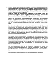 3 2. Im Rahmen des Vergleiches von verschiedenen Vorranggebieten mit un- terschiedlichen Zielsetzungen: Nach welchen Grundlagen, Regeln, gesetzlichen Vorschriften erfolgt die Abwägung einer Entscheidung, wenn zwischen zwei Vorranggebieten mit unterschiedlicher Nutzungsrichtung, die um denselben Standort konkurrie- ren, entschieden werden muss? Entsprechend dem Landesentwicklungsplan 2010 (LEP 2010) des Landes Sachsen-Anhalt, Z 109, liegt zur räumlichen Konzentration von Windenergiean- lagen in VR-/EG für die Nutzung der Windenergie in Regionalen Entwicklungs- plänen eine abschließende flächendeckende Planung vor. Darin ist bei der Fest- legung der VR-/EG insbesondere die Wirkung von Windkraftanlagen auf: (1) Ortsbild, Stadtsilhouette, großräumige Sichtachsen und Landschaftsbild, (2) Siedlungen und kommunale Planungsabsichten, (3) Kulturgüter und sonstige Sachgüter, (4) räumliche Wirtschafts-, Tourismus- und Erholungsfunktionen sowie (5) Naturhaushalt und naturräumliche Gegebenheiten in der Abwägung zu berücksichtigen (LEP 2010, Z 111). 3. Welche Landkreise und kreisfreien Städte haben in den letzten zehn Jahren aufgrund von Klagen, innerhalb von Gerichtsverfahren oder eigenem Be- schluss, den Bau von Windenergieanlagen bzw. Windparks in Windvor- ranggebieten bzw. außerhalb derselben verhindert? Bitte Einzelverfahren (Urteil mit Aktenzeichen) benennen und den Land- kreisen/kreisfreien Städten zuordnen. Die erfragten Angaben sind der Anlage zu entnehmen; auf die Vorbemerkung der Landesregierung wird im Übrigen verwiesen. 4. Welche Gelder haben die Landkreise und kreisfreien Städte in Sachsen- Anhalt seit 2007 für Klageverfahren im Rahmen der Auseinandersetzung um Windkraftprojekte ausgegeben? Bitte die Kosten (€) differenzieren in Kosten (€) für eigene Klagen der Kommunen/kreisfreien Städte und Kosten (€) für Verfahren, in denen die Kommunen/kreisfreien Städte als Beklagte betroffen waren. Die erfragten Angaben sind der Anlage zu entnehmen; im Übrigen wird auf die Vorbemerkung der Landesregierung verwiesen. Die Landkreise Altmarkkreis Salzwedel, Börde, Burgenlandkreis, Harz, Jerichower Land, Salzlandkreis, Sten- dal und Wittenberg sowie die kreisfreien Städte Dessau-Roßlau und Halle (Saa- le) haben mitgeteilt, dass dort keine der erfragten Ausgaben entstanden sind. Ergänzend wird darauf hingewiesen, dass dem Burgenlandkreis im Jahr 2016 Verfahrenskosten i. H. v. 11.375,00 EUR entstanden sind, da der Landkreis mit Urteil des Verwaltungsgerichts Halle vom 26. April 2016 zur Erteilung einer Ge- nehmigung für eine Windenergieanlage zugunsten eines Unternehmens ver- pflichtet worden ist.