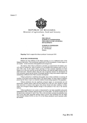 Tobacco growers are located in the less favored arcas and areas, planted with Oriental tobacco, can hardly be used to grow alternative crops. That is why ihe process of establishing alternative activities in Bulgaria is very difficult. period 2015-2020, which is a continuation of the National Payment Scheme. It is aimed at additional support for tobacco growers provides an opportunity for a structural reorientation of the sector and redirects farmers from traditional tobacco production areas to alternative activities, while adapting to the new market conditions and requirements of the agricultural policy. During the period of application of the two tobacco specific schemes - from 2013 10 2017, the Compound Annual Growth Rate (CAGR) of reduction of tobacco arcas in the country is 14%. The harvested areas for the period 2013-2016 show an average annual rate of decrcase of 21%. The downward trend in Oriental tobacco is the strongest (27%). which occupies most of the tobacco areas in the country. The average annual rate of decline in tobacco production in Bulgaria for the period 2013-2016 is 25%. In 2016, 15 211 tons of tobacco were produced in Bulgaria, while in 2013 the production amounted to 36 446 tons. A significant decrease is also observed in the value of the final tobacco production, with the average annual rate of decline of 14% for the period 2013-2017. The number of tobacco producers is also decreasing every year. Transitional National Aid makes it possible for farmers, who have previously relied prevention of abandonment of farming and less favored areas depopulation. Tobacco production in Bulgaria is in the process of significant restructuring which has not finished yet. Abolition of the complementary support of the tobacco producers income could lead to further deterioration of the social and demographic situation in Ihe regions, which will aggravate the local economy, which goes against CAP efforts to ensure balanced regional development. It carries the risk that agricultural producers return to this production before the end of the sector restructuring process, going on in the country. It is therefore necessary to continue the policy of support until the final restructuring. The sector needs a longer period of time to find its balance, without causing serious damage to the vulnerable regions of the country which have no other economic alternatives. The cessation of cultivation of this type of crop in ihe EU will not lead to the suspension of its use, but to an increase in its import. DEAR COMMISSIONER, By emphasizing my strong concem about the future of tobacco producers and the need to smoothly and painlessiy finalize the restructuring of tobacco production and its gradual replacement with other agricultural and non-agricultural activities in sensitive regions, I hope that the Commission will take into account the above information. We should treat tobacco producers like all other farmers in the EU. I expect the possibility for continuation of the support for tobacco producers’ incomes to be provided beyond 2020, by decoupled national transitional tobacco aid being eligible for inclusion in the National Strategic Plan. Please accept, Mr. Hogan, the assurances of our highest consideration Best Regards Page 29 of 32