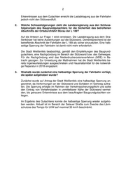 2 Erkenntnissen aus dem Gutachten erreicht die Lastabtragung aus der Fahrbahn jedoch nicht den Stützwandfuß. 2. Welche Schlussfolgerungen zieht die Landesregierung aus den Schluss- folgerungen des Baugrundgutachters für die Sicherheit des betroffenen Abschnitts der Ortsdurchfahrt Borau der L 189? Auf die Antwort zur Frage 1 wird verwiesen. Die Lastabtragung aus dem Stra- ßenkörper hat keine Auswirkungen auf die Stützwand. Dementsprechend ist der betreffende Abschnitt der Fahrbahn der L 189 als sicher einzustufen. Eine halb- seitige Sperrung der Fahrbahn ist damit nicht mehr erforderlich. Die Stadt Weißenfels beabsichtigt, gemäß den Empfehlungen des Baugrund- gutachters, eine Nachgründung im Bereich der Stützwand bzw. des Gehweges. Für die Nachgründung wird das Niederdruckerosionsverfahren (NDE) in Be- tracht gezogen. Zur Umsetzung der Maßnahmen hat die Stadt Weißenfels be- reits Ingenieurleistungen ausgeschrieben und Haushaltsmittel für die notwendi- ge Reparatur in 2018 eingeplant. 3. Weshalb wurde zunächst eine halbseitige Sperrung der Fahrbahn verfügt, die später aufgehoben wurde? Zunächst wurde auf Antrag der Stadt Weißenfels eine halbseitige Sperrung an- geordnet, da Verformungen an der Stützwand und Schäden im Gehweg auftra- ten. Die Sperrung erfolgte im Rahmen der Verkehrssicherungspflicht und sollte den Eintrag von Verkehrslasten in unmittelbarer Nähe der Stützwand vermei- den, bis genauere Erkenntnisse aus dem beauftragten Baugrundgutachten vor- liegen. Im Ergebnis des Gutachtens konnte die halbseitige Sperrung wieder aufgeho- ben werden. Aktuell ist im Bereich der Selauer Straße zum Zwecke des Lärm- schutzes das Tempo für LKW auf maximal 30 km/h beschränkt.