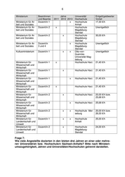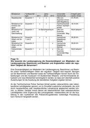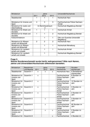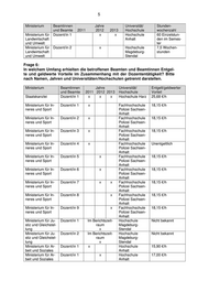 8 Ministerium Tarifbeschäf- Jahre Universität/ Entgelt/ geld- tigte 2011 2012 2013 Hochschule werter Vorteil Staatskanzlei Dozent/in 1 x x Otto-von- 31,70 €/h Guericke-Univer- sität Magdeburg Ministerium für Dozent/in 1 x x Fachhochschule 18,15 €/h Inneres und Polizei Sachsen- Sport Anhalt Ministerium für Dozent/in 1 Im Berichtszeitraum Otto-von- Nicht bekannt Justiz und x Guericke- Gleichstellung Universität Mag- deburg Ministerium für Dozent/in x x Hochschule 28,26 €/h Arbeit und So- 1 und 2 Magdeburg- ziales Stendal Ministerium für Dozent/in 3 x Hochschule 30,00 €/h Arbeit und So- Magdeburg- ziales Stendal Kultusministe- Dozent/in 1 x x x Otto-von- Nicht bekannt rium Guericke- Universität Mag- deburg Frage 10: Wie bewertet die Landesregierung die Dozententätigkeit von Mitgliedern der Landesregierung, Beamtinnen und Beamten und Angestellten neben der regu- lären Tätigkeit der Benannten? Eine Dozententätigkeit von Mitgliedern der Landesregierung, Beamtinnen und Beam- ten sowie Tarifbeschäftigten neben der regulären Tätigkeit wird begrüßt. Bezogen auf die Beamtinnen und Beamten sowie die Tarifbeschäftigten können durch die Vor- bereitungen und den Austausch mit Studierenden Wissens- und Kenntnisstände ak- tualisiert und neue Blickwinkel kennengelernt werden, so dass sich ebenfalls positive Auswirkungen für die Ausübung der dienstlichen Aufgaben ergeben können. An der Fachhochschule Polizei Sachsen-Anhalt werden nebenamtliche oder neben- berufliche Lehrtätigkeiten genutzt, um im Einzelfall zusätzliche Lehrbedarfe, die nicht durch hauptamtliches oder hauptberufliches Lehrpersonal abgesichert werden kön- nen, zu decken. Darüber hinaus dienen die nebenamtlichen oder nebenberuflichen Lehrtätigkeiten einer Ergänzung des Lehrangebotes. Insbesondere der für die Aus- bildung in den Laufbahnen des Polizeivollzugsdienstes notwendige Praxisbezug kann hierdurch hergestellt werden.