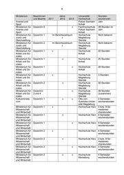7 Ministerium Jahre Universität/Hochschule 2011 2012 2013 Staatskanzlei 1 Otto-von-Guericke-Universität Magdeburg Ministerium für Inneres 1 1 1 Fachhochschule Polizei Sachsen- und Sport Anhalt Ministerium für Justiz und Im Berichtszeitraum Otto-von-Guericke-Universität Gleichstellung 1 Magdeburg Ministerium für Arbeit und 2 2 1 Hochschule Magdeburg-Stendal Soziales Kultusministerium 1 1 1 Otto-von-Guericke-Universität Magdeburg Frage 8: Welche Stundenwochenzahl wird hierfür wahrgenommen? Bitte nach Namen, Jahren und Universitäten/Hochschulen differenziert darstellen. Ministerium Tarifbe- Jahre Universität/ Stunden- schäftigte 2011 2012 2013 Hochschule wochenzahl Staatskanzlei Dozent/in 1 x Otto-von-Guericke- 1,66 Sommer- Universität Magde- semester; burg 0,8 Winter- semester Ministerium für Dozent/in 1 x Fachhochschule 2 Stunden im Inneres und Polizei Sachsen- Jahr Sport Anhalt Ministerium für Dozent/in 1 x Fachhochschule 3 Stunden im Inneres und Polizei Sachsen- Jahr Sport Anhalt Ministerium für Dozent/in 1 Im Berichtszeitraum Otto-von-Guericke- Nicht be- Justiz und x Universität Magde- kannt Gleichstellung burg Ministerium für Dozent/in x X Hochschule Mag- 46 Stunden Arbeit und Sozi- 1 und 2 deburg-Stendal (zusammen) ales Ministerium für Dozent/in 3 x Hochschule Mag- 16 Stunden Arbeit und Sozi- deburg-Stendal ales Kultusministeri- Dozent/in 1 x x x Otto-von-Guericke- 4 Semester- um Universität Magde- wochenstun- burg den Frage 9: In welchem Umfang erhielten die betroffenen Angestellten Entgelte und geld- werte Vorteile im Zusammenhang mit der Dozententätigkeit? Bitte nach Namen, Jahren und Universitäten/Hochschulen getrennt darstellen.