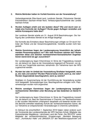 2 2. Welche Behörden hatten im Vorfeld Kenntnis von der Veranstaltung? Verbandsgemeinde Elbe-Havel-Land, Landkreis Stendal, Polizeirevier Stendal, Polizeidirektion Sachsen-Anhalt Nord, Verfassungsschutzbehörde des Landes Sachsen-Anhalt. 3. Wurden Auflagen erteilt und wie lauteten diese? Wie und durch wen er- folgte eine Kontrolle der Auflagen? Wurde gegen Auflagen verstoßen und welche Konsequenz hatte dies? Der Landkreis Stendal erteilte am 31. August 2018 Beschränkungen. Die Ver- fügung des Landkreises Stendal ist als Anlage beigefügt. Die Kontrolle des Einhaltens dieser Beschränkungen erfolgte vor Ort durch Ver- treter der Polizei und der Versammlungsbehörde. Verstöße wurden nicht fest- gestellt. 4. Welche Kenntnisse liegen der Landesregierung hinsichtlich der teilneh- menden Personengruppe(n) vor? Wie viele Personen nahmen teil? Woher stammten diese und welchen rechtsextremen/neonazistischen Organisa- tionen waren/sind sie ggf. zuzuordnen? Der Landesregierung liegen Erkenntnisse im Sinne der Fragestellung insoweit vor, als bekannt ist, dass an der Veranstaltung insgesamt elf Personen, von de- nen drei aus Tangerhütte stammen, teilnahmen. Ein Teilnehmer kann der NPD zugerechnet werden. 5. Wurden bei oder im Umfeld der Veranstaltung Straftaten festgestellt, wenn ja, wie viele und welche? Wurden Platzverweise erteilt, wenn ja, wie viele? Wurden Gegenstände beschlagnahmt, wenn ja, welche? Straftaten im Zusammenhang mit der Durchführung der Veranstaltung wurden nicht festgestellt. Sicherstellungen bzw. Beschlagnahmen erfolgten nicht. Platz- verweisungen wurden nicht angeordnet. 6. Welche sonstigen Kenntnisse liegen der Landesregierung bezüglich rechtsextremer Aktivitäten unter Berufung auf das Gedenken an Daniel H. vor? Der Landesregierung liegen Erkenntnisse im Sinne der Fragestellung insoweit vor, als bekannt ist, dass die Geschehnisse in Chemnitz von Rechtsextremisten in den sozialen Netzwerken umfangreich dargestellt und bewertet worden sind. Die Berichte enthielten beständig Aufrufe der rechtsextremistischen Szene, die zur Teilnahme an entsprechenden Veranstaltungen in Chemnitz aufforderten. Im Zeitraum bis einschließlich 1. September 2018 folgten neben anderen auch der Vorsitzende des Landesverbandes der NPD Sachsen-Anhalt, Mitglieder des Kreisverbandes Magdeburg / Jerichower Land der Partei „Die RECHTE“ sowie Mitglieder der rechtsextremistischen Gruppierungen „Identitäre Bewegung Harz“, „Kontrakultur Halle“ und „MAGIDA 2.0“ den Mobilisierungsaufrufen und