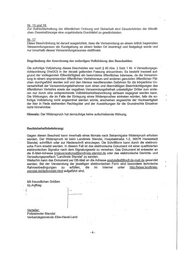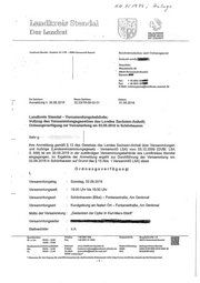 llc-I ~ li nS'j 'In «0,)1 I!'),V'T~ ('f~ 0 ?j t.~ ,·-="j;9~,.l.h 1'., .':-o.-c>,JI,~,!, "="~ ~'" [,~. )[}e:rr Lsurndhco1i!: ':\ OI~.AI.TMAF:U( GRaNE WIESE MIT ZUI(UNFT Landkreis StendaJ - Postfach 10 14 B6 - 39664 Hansestadt Siendal Dienstsit.z! VVendatraße 30 39676 Hanflestadt Stendat Zimmer:~: ' I Tel.: + 49 3931 6~ Fa."l:: + 49 3931 60.1;._ E-Mail: ordnungsarnt@landltreis-stendai.de Ihr Zeichen: Unser Z.eichen: batum: ( Anmeldung v. 30.08.20'18 32.03/18-09-02-0'1 31.08.2018 IL~Wildkli'ei!!O Stendal - Vel"®ammI8Jfi191$b®li'Iöv-d!®; VollzaJlg des VSII'$amm!ung®ge®®tt4:s$ des l~U1des S~Ch$f;H"ihA.nhalt~ Oranungsvei1'ügung zur Vil'Ii'sammh.Iß2) am 02.09.20'18 in Schönhausen Sehrg Ihre Anmeldung gemäß § 12 des Gesetzes des Landes Sachsen-Anhalt über VersammlLlngen und Aufzüge (Landesversammlungsgesetz - VersammlG LSA) vom 03.12.2009 (GVBI. LSA S.558) ist €Im 30.08.2018 in der zuständigen Versammlungsbehörde des Landkreises Sfendal eingegangen. Im Ergebnis der Anmeldung ergeht zur Durchführung der Versammlung am 02.09.2018 in Schönhausen auf Grund des § 13 Abs. ·1 VersammlG LSA) diese () r rd D1 U n 9 s ver f ÜJ 9 Lß lfI g: I. Versammlungstag Sonntag, 02.09.2018 VersammlLlngszeit 18:00 Uhr bis 19:00 Uhr Versammlungsort Schönhausen (Eibe) - Fontanestraße, Am Denkmal Versammlungsart Kundgebung am "festen Ort - Fontanestraße, Am Denkmal Motto der Versammlung: "Gedenken der Opfer in Karl-Marx-Stadt" Versammlungsleiter Stellvertreter kA Spreohzeiten: Telefon: +493931 606 Poatansohrift: Hospitalstraße 1-2 DI. \1. Do. 09:00 - 12:00 1'"",: +493931 21 3060 39676 Hanuestadt Slendal 14:00- 17:00 Straßenverkehraamt lIUsäl~\Ioh: Internet: ' www.landkreis·slendal.de Bnnkv'erbindung: Krefssparkasse Slendal . Mo. 09:00- 12:00 E-Mail: kreisvelWaltung@l!ll1dk... is-stendal.de mAN: DE63 8106 0666 3010 00119 38 Fr. 08:00 - 11 :00 De-M~lI: pogtRtelle@lksdl.de.mall.de~· BIG: NOJJIDE21S0L EGVP vorhanden" 1, Hinweise für den Zugang für sohriftfOntlelllelzende elektronls<:he Dokumente \lI\ter http://www.landkreis.stendal.de/de/kontakl.hlml ~ 1-
