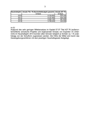 3 Haushaltsjahr Ansatz TGr. 76 (Sachmittelbudgets gesamt) Ansatz 427 76 in Euro in Euro 2010 8.154.600 634.700 2011 8.157.400 634.700 2012 8.362.100 867.600 2013 5.789.200 224.000 zu b) Aufgrund des sehr geringen Mittelansatzes im Kapitel 07 07 Titel 427 76 (außerun- terrichtliche schulische Projekte und ergänzender Einsatz von Experten im Unter- richt) im Haushaltsjahr 2013 konnten allen Schulen lediglich je Schüler ca. 1 € unab- hängig von der Schulform zugewiesen werden. Die Höhe der Mittel wird durch das Gesetzgebungsverfahren mit dem jeweiligen Haushaltsgesetz festgelegt.