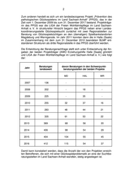 2 Zum anderen handelt es sich um ein landesbezogenes Projekt „Prävention des pathologischen Glücksspielens im Land Sachsen-Anhalt“ (PPGS), das in der Zeit vom 1. Dezember 2009 bis zum 31. Dezember 2017 bestand. Projektträge- rin des PPGS war die LIGA der Freien Wohlfahrtspflege im Land Sachsen- Anhalt e. V. In struktureller Hinsicht begann das PPGS neben einer Landes- koordinierungsstelle Glücksspielsucht zunächst mit zwei Regionalstellen zur Beratung von Glücksspielsüchtigen an den (damaligen) Spielbankstandorten Magdeburg und Wernigerode. Im Jahr 2011 konnten dann die in Halle (Saale) im Zusammenhang mit dem zum 31. Dezember 2010 beendeten BLMP ent- standenen Strukturen als dritte Regionalstelle in das PPGS überführt werden. Die Entwicklung der Beratungsnachfrage stellt sich unter Einbeziehung der An- gaben der beiden Projektträger (AWO Erziehungshilfe Halle [Saale] gGmbH und LIGA der Freien Wohlfahrtspflege im Land Sachsen-Anhalt e. V.) wie folgt dar: Beratungen davon Beratungen in den Schwerpunkt- Jahr landesweit beratungsstellen der beiden Projekte MD HAL WR 2007 136 - - - 2008 202 - 18 - 2009 225 - 35 - 2010 255 32 37 16 2011 283 48 44 21 2012 335 61 53 22 2013 369 68 56 20 2014 406 98 54 29 2015 404 104 55 45 2016 412 115 54 37 Damit kann konstatiert werden, dass die Anzahl der von den Projekten erreich- ten Betroffenen, die sich mit einer Glücksspielproblematik an eine der Suchtbe- ratungsstellen im Land Sachsen-Anhalt wandten, stetig angestiegen ist.