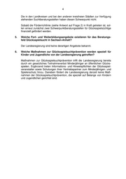 4 Die in den Landkreisen und bei den anderen kreisfreien Städten zur Verfügung stehenden Suchtberatungsstellen haben diesen Schwerpunkt nicht. Sobald die Förderrichtlinie (siehe Antwort auf Frage 2) in Kraft getreten ist, sol- len erneut zunächst zwei Schwerpunktberatungsstellen für Glücksspielsüchtige finanziell gefördert werden. 5. Welche Fort- und Weiterbildungsangebote existieren für das Beratungs- feld Glücksspielsucht in Sachsen-Anhalt? Der Landesregierung sind keine derartigen Angebote bekannt. 6. Welche Maßnahmen zur Glücksspielsuchtprävention werden speziell für Kinder und Jugendliche von der Landesregierung getroffen? Maßnahmen zur Glücksspielsuchtprävention trifft die Landesregierung bereits durch ein gesetzliches Teilnahmeverbot Minderjähriger an öffentlichen Glücks- spielen. Ergänzend treten Informations- und Hinweispflichten der Glücksspiel- veranstalter sowie Schulungen ihrer Vertriebspartner zum Minderjährigen- und Spielerschutz hinzu. Daneben fördert die Landesregierung derzeit keine Maß- nahmen der Glücksspielsuchtprävention, die speziell auf Belange von Kindern und Jugendlichen gerichtet sind.