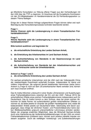 2 ge öffentliche Konsultation zur Klärung offener Fragen aus den Verhandlungen mit den USA über die TTIP zu beginnen. Im Anschluss will die Europäische Kommission mit den EU-Mitgliedstaaten im Handelsministerrat die EU-Verhandlungsposition zu diesem Thema festlegen. Einige der in dieser Kleinen Anfrage aufgeworfenen Fragen können daher erst nach Beendigung des Konsultationsprozesses konkreter beantwortet werden. Frage 1: Welche Chancen sieht die Landesregierung in einem Transatlantischen Frei- handelsabkommen? Frage 2: Welche Nachteile sieht die Landesregierung in einem Transatlantischen Frei- handelsabkommen? Bitte konkret ausführen und begründen für a. die wirtschaftliche Entwicklung des Landes Sachsen-Anhalt, b. die Entwicklung des Arbeitsmarktes im Land Sachsen-Anhalt, c. die Aufrechterhaltung von Standards in der Daseinsvorsorge im Land Sachsen-Anhalt, d. die Aufrechterhaltung von Standards bei den Arbeitnehmerrechten und beim Verbraucher sowie bei Umweltstandards. Antwort zu Frage 1 und 2: a. die wirtschaftliche Entwicklung des Landes Sachsen-Anhalt Für sachsen-anhaltische Unternehmen sind die USA nach der Volksrepublik China der zweitwichtigste Exportmarkt außerhalb Europas. Insbesondere für kleine und mittlere Unternehmen, die aufgrund derzeit bestehender Hemmnisse (siehe hierzu Antwort zu Frage 6) nicht auf dem US-amerikanischen Markt vertreten sind, können sich neue Chancen eröffnen. Das ifo Institut München untersucht in einer Studie („Dimensionen und Auswirkungen eines Freihandelsabkommens zwischen der EU und den USA“, Februar 2013) die wirtschaftlichen Effekte eines solchen Freihandelsabkommens insbesondere auch für Deutschland. Das ifo Institut kommt zu dem Schluss, dass bei einem solchen Ab- kommen für beide Partner mit außerordentlich großen wirtschaftlichen Effekten zu rechnen ist, da beide jeweils für einander die größten Handelspartner sind, wobei die bedeutendsten Anteile jeweils auf Deutschland fallen. Gleichzeitig wird davon aus- gegangen, dass infolge der ähnlichen Kosten- und Produktivitätsstruktur keine star- ken Wettbewerbseffekte aufgrund unterschiedlicher Lohnniveaus eintreten werden. Neben der eingangs erwähnten Möglichkeit, dass die Wirtschaft Sachsen-Anhalts durch eine Intensivierung der Außenwirtschaftsbeziehungen mit den USA von einem Freihandelsabkommen profitieren kann, können auch positive indirekte Impulse von diesem ausgehen. Durch die vielfältigen Vorleistungs- und Zuliefererbeziehungen