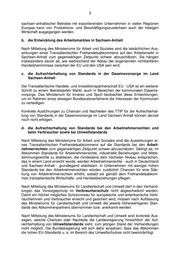3 sachsen-anhaltischer Betriebe mit exportierenden Unternehmen in vielen Regionen Europas kann von Produktions- und Beschäftigungszuwächsen auch der hiesigen Wirtschaft ausgegangen werden. b. die Entwicklung des Arbeitsmarktes in Sachsen-Anhalt Nach Mitteilung des Ministeriums für Arbeit und Soziales sind die tatsächlichen Aus- wirkungen eines Transatlantischen Freihandelsabkommens auf den Arbeitsmarkt in Sachsen-Anhalt zum gegenwärtigen Zeitpunkt schwer abzuschätzen. Sie hängen insbesondere davon ab, wie weitreichend der Abbau der sogenannten nichttarifären Handelshemmnisse zwischen der EU und den USA sein wird. c. die Aufrechterhaltung von Standards in der Daseinsvorsorge im Land Sachsen-Anhalt Die Transatlantische Handels- und Investitionspartnerschaft EU - USA ist ein weiterer Schritt zu einem liberalisierten Markt, auch in Bereichen der kommunalen Daseins- vorsorge. Das Ministerium für Inneres und Sport beobachtet diese Entwicklungen, um im Rahmen eines etwaigen Bundesratsverfahrens die Interessen der Kommunen zu verteidigen. Konkrete Ausführungen zu Chancen und Nachteilen des TTIP für die Aufrechterhal- tung von Standards in der Daseinsvorsorge im Land Sachsen-Anhalt können derzeit noch nicht erfolgen. d. die Aufrechterhaltung von Standards bei den Arbeitnehmerrechten und beim Verbraucher sowie bei Umweltstandards Nach Mitteilung des Ministeriums für Arbeit und Soziales sind die Auswirkungen ei- nes Transatlantischen Freihandelsabkommens auf die Standards bei den Arbeit- nehmerrechten zum gegenwärtigen Zeitpunkt schwer abzuschätzen. Gelingt es, im Abkommen Standards für Arbeitnehmerrechte, industrielle Beziehungen und Mitbe- stimmungsrechte zu etablieren, die mindestens dem höchsten Niveau entsprechen, das in einem Land erreicht wurde, werden Arbeitnehmerrechte - auch in Deutschland und Sachsen-Anhalt - grundlegend stabilisiert. In Unternehmen mit weniger hohen Standards bei den Arbeitnehmerrechten würden zusätzlich Chancen für eine Stär- kung von Arbeitnehmerrechten erhöht, sobald sie gemäß dem Freihandelsabkom- men transatlantische Wirtschafts- und Handelsbeziehungen pflegen. Nach Mitteilung des Ministeriums für Landwirtschaft und Umwelt darf in den Verhand- lungen das Vorsorgeprinzip im Verbraucherschutz nicht abgeschwächt werden. Damit ein höchst mögliches Schutzniveau für europäische und amerikanische Verb- raucherinnen und Verbraucher erreicht und gesichert wird, müssen nach Auffassung des Ministeriums für Landwirtschaft und Umwelt die jeweils höherwertigeren Stan- dards des Abkommenpartners übernommen bzw. anerkannt werden. Nach Mitteilung des Ministeriums für Landwirtschaft und Umwelt sind konkrete Aus- sagen, welche Chancen oder Nachteile die Landesregierung hinsichtlich der Auf- rechterhaltung von Umweltstandards sieht, zum jetzigen Stand der Verhandlungen nicht möglich. Die Bundesregierung will sich dafür einsetzen, dass das Abkommen die hohen EU-Standards u. a. im Bereich des Umweltschutzes nicht beeinträchtigt.