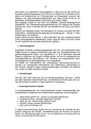 12 gen Kinder und Jugendliche“ herausgegeben, in dem auch auf das Thema se- xualisierte Gewalt eingegangen wird. Sie ist ein Leitfaden für Lehrkräfte und Er- zieher und Erzieherinnen zur Früherkennung, zur Kooperation zwischen den Akteuren und zeigt Handlungsmöglichkeiten auf. Diese Schrift wurde an Ju- gendämter, Kindertagesstätten und Schulen des Landes verteilt. Neu aufgelegt wurden im Jahr 2012 die Faltblätter „Sexuelle Belästigung am Arbeitsplatz“ und „Opferberatung/Zeugenbetreuung: Ein Angebot des Sozialen Dienstes der Justiz in Sachsen-Anhalt“ des Ministeriums für Justiz und Gleich- stellung. Ebenso neu aufgelegt wurden vom Ministerium für Inneres und Sport die Infor- mationsflyer „Kindesmisshandlung/Kindesvernachlässigung“, „Gewalt in Paar- beziehungen“ und „Stalking“. Zudem werden mit dem Heft Nr. 7 „Nein heißt nein“ der vom Landeskriminalamt (LKA) herausgegebenen Malheftserie „Super Tipps für Klein und Groß“ Kinder vor den Gefahren des sexuellen Missbrauchs gewarnt. • Internetangebote Zusätzliche Hinweise zu Beratungsangeboten der vom Land geförderten freien Träger können im Internet recherchiert oder über das „Kompetenzzentrum für geschlechtergerechte Kinder- und Jugendhilfe e. V.“ (z. B. Broschüre „Sexuelle Gewalt an Mädchen und Jungen“) erfragt werden. Auf die im Landesportal res- sortzugeschnittenen Informationen und Verweise auf entsprechende Bera- tungsangebote und Hilfsmöglichkeiten wird hingewiesen. So enthält der Internetauftritt der Landespolizei (www.polizei.sachsen-an- halt.de) z. B. verschiedene Informationen zum Opferschutz, insbesondere zu den Themen "Gewalt in engen sozialen Beziehungen und Fällen von Stalking“ und „Kinder als Opfer häuslicher Gewalt“. • Ausstellungen Seit dem Jahr 2007 stellt das LKA die Wanderausstellung „Zerrissen - Kinder als Opfer häuslicher Gewalt“ Behörden und öffentlichen Einrichtungen des Lan- des auf Anfrage für jeweils 14 Tage kostenfrei zur Verfügung. • Kriminalpräventive Projekte Im Zuständigkeitsbereich der Polizeidirektionen werden bedarfsorientiert the- menspezifische Projekte der Kriminalprävention angeboten und durchgeführt: o „Mein Körper gehört mir“ - Schutz vor sexuellem Missbrauch o „Kinderkommissar / Verhalten gegenüber Fremden“ o „Nicht mit mir! - Starke Kinder schützen sich!“ o „Gewalt in engen sozialen Beziehungen“ o „Geh nicht mit Fremden mit“. In diesem Zusammenhang werden bei der Umsetzung der Projekte die Bro- schüren „Wege aus der Gewalt“, „Gewalterfahrungen von Kindern und Jugend- lichen“ und „Kinderschutz geht alle an“ von der Polizeilichen Kriminalprävention der Länder und des Bundes (ProPK) genutzt.