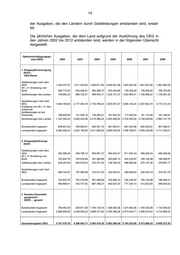 14 der Ausgaben, die den Ländern durch Geldleistungen entstanden sind, erstat- tet. Die jährlichen Ausgaben, die dem Land aufgrund der Ausführung des OEG in den Jahren 2002 bis 2012 entstanden sind, werden in der folgenden Übersicht dargestellt. Opferentschädigungsge- setz (OEG) 2002 2003 2004 2005 2006 2007 2008 1. Kriegsopferversorgung (KOV) - OEG-Rente Geldleistungen nach dem OEG 1.249.437,07 1.611.232,02 1.660.671,85 2.048.551,69 1.823.322,35 1.847.647,06 1.891.802,09 40 v. H. Erstattung vom Bund 499.774,83 644.492,81 664.268,74 819.420,68 729.328,94 739.058,82 756.720,84 Geldleistungen des Landes 749.662,24 966.739,21 996.403,11 1.229.131,01 1.093.993,41 1.108.588,24 1.135.081,25 Sachleistungen nach dem OEG 1.849.199,00 2.177.943,79 2.153.769,45 2.625.051,57 2.880.130,24 2.927.820,74 3.173.313,43 Erstattung von 40 v. H. des Anteils der Geldleistungen an der Pauschale 106.852,80 121.500,10 138.283,01 161.643,53 177.925,04 181.172,09 191.185,67 Sachleistungen des Landes 1.742.346,20 2.056.443,69 2.015.486,44 2.463.408,04 2.702.205,20 2.746.648,65 2.982.127,76 Bundesanteil insgesamt 606.627,63 765.992,91 802.551,75 981.064,21 907.253,98 920.230,91 947.906,51 Landesanteil insgesamt 2.492.008,44 3.023.182,90 3.011.889,55 3.692.539,05 3.796.198,61 3.855.236,89 4.117.209,01 2. Kriegsopferfürsorge (KOF) Geldleistungen nach dem OEG 382.089,40 409.796,72 953.951,73 564.640,37 811.097,43 460.262,44 466.496,28 40 v. H. Erstattung vom Bund 152.835,76 163.918,68 381.580,69 225.856,15 324.438,97 184.104,98 186.598,51 Geldleistungen des Landes 229.253,64 245.878,04 572.371,04 338.784,22 486.658,46 276.157,46 279.897,77 Sachleistungen nach dem OEG 266.744,87 187.869,58 315.017,23 324.042,81 290.685,64 236.876,19 318.761,75 Bundesanteil insgesamt 152.835,76 163.918,68 381.580,69 225.856,15 324.438,97 184.104,98 186.598,51 Landesanteil insgesamt 495.998,51 433.747,62 887.388,27 662.827,03 777.344,10 513.033,65 598.659,52 3. Soziales Entschädi- gungsrecht (SER) – gesamt Bundesanteil insgesamt 759.463,39 929.911,59 1.184.132,44 1.206.920,36 1.231.692,95 1.104.335,89 1.134.505,02 Landesanteil insgesamt 2.988.006,95 3.456.930,52 3.899.277,82 4.355.366,08 4.573.542,71 4.368.270,54 4.715.868,53 Gesamtausgaben OEG 3.747.470,34 4.386.842,11 5.083.410,26 5.562.286,44 5.705.235,66 5.472.606,43 6.850.373,55