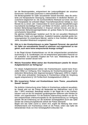 17 ten die Beratungsstellen, entsprechend der Leistungsfähigkeit der einzelnen Kommunen, kommunale Zuschüsse in unterschiedlicher Höhe. Die Beratungsstellen für Opfer sexualisierter Gewalt berichten, dass die ambu- lante und therapeutische Versorgung, insbesondere im ländlichen Bereich, un- zureichend abgesichert ist. Die durchschnittliche Wartezeit auf einen ambulan- ten Therapieplatz bei ambulant tätigen Traumatherapeutinnen beträgt ca. neun Monate bis zu einem Jahr. Insbesondere für durch sexuelle Gewalterfahrungen traumatisierte berufstätige Frauen und Mütter mit Kindern, welche oft keine sta- tionären Behandlungsmöglichkeiten in Anspruch nehmen können, sind die un- zureichenden Behandlungsmöglichkeiten ein großes Risiko für ihre psychische und physische Gesundheit. Die gleichen Gefährdungen bestehen auch für die von sexuellem Missbrauch betroffenen Kinder und Jugendlichen. Zusätzlich bestehen ebenfalls große Ver- sorgungslücken für erwachsene Männer, welche in ihrer Kindheit, oftmals über Jahre, sexuellem Missbrauch ausgesetzt waren. 16. Gibt es in den Krankenhäusern zu jeder Tageszeit Personal, das geschult ist, Opfer von sexualisierter Gewalt zu erkennen und angemessen zu rea- gieren, auch wenn keine entsprechende Anzeige vorliegt? In der Regel können Krankenhäuser nur mit der entsprechenden somatischen Ausrichtung (z. B. Gynäkologie) und mit entsprechend geschultem Personal vor Ort aufwarten. Ein spezielles Angebot der Fort- bzw. Weiterbildung über die Ärztekammer existiert derzeit nicht. 17. Welche finanziellen Mittel stehen den Krankenhäusern jeweils für diesen Aufgabenbereich zur Verfügung? Für diesen Aufgabenbereich stehen den Krankenhäusern explizit keine finan- ziellen Mittel zur Verfügung. Eine Vergütung der Krankenhausleistungen ist bei stationärer Behandlung über diagnose-bezogene Fallgruppen (DRG’s) möglich. Im Falle einer ambulanten Versorgung im Krankenhaus erfolgt die Vergütung regulär entsprechend § 120 Fünftes Buch Sozialgesetzbuch (SGB V). 18. Wie kooperieren Polizei und Krankenhäuser beim Thema „sexualisierte Gewalt“ derzeit? Die ärztliche Untersuchung eines Opfers im Krankenhaus aufgrund sexualisier- ter Gewalt wird von der Polizei als Bestandteil der Maßnahmen nach § 163 Abs. 1 StPO veranlasst. Beauftragt werden in der Regel die in den Kranken- häusern rund um die Uhr besetzten gynäkologischen Stationen oder Kliniken für Kinder- und Jugendmedizin. Für die ärztliche Untersuchung werden von der Po- lizei entsprechende Untersuchungssets für die Spurensicherung zur Verfügung gestellt. Mit der Entbindung von der ärztlichen Schweigepflicht durch das Opfer werden die Untersuchungsbefunde zeitnah der Polizei übersandt. Begibt sich das Opfer zuerst zu einem Arzt, ergeht die Meldung über einen Straftatverdacht vom Krankenhaus direkt an die Polizei, sofern das Opfer die behandelnden Ärzte von ihrer Schweigepflicht entbunden hat.