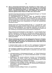 18 19. Gibt es Kriseninterventionsteams bzw. Konzepte für solche Teams, um Kindertageseinrichtungen bzw. Schulen beim Umgang mit (vermuteten) Gewalt- und Missbrauchsvorfällen zu unterstützen? Wenn ja, wie viele Teams in Sachsen-Anhalt gibt es bzw. sind vorgesehen und welche Pro- fessionen gehören diesen Teams an? Wenn nein, warum nicht? Spezielle Kriseninterventionsteams für Kindertageseinrichtungen zur Thematik des sexualisierten Missbrauchs gibt es nicht. Im Zuständigkeitsbereich der örtlichen Träger der Jugendhilfe existieren flächendeckend „Lokale Netzwerke Kinderschutz“ gemäß § 3 Abs. 3 des Ge- setzes zum Schutz des Kindeswohls und zur Förderung der Kindergesundheit (Kinderschutzgesetz), in denen unter anderem je nach regionalen Schwerpunk- ten der örtlichen Akteure auch Kooperationen mit Polizei und Justizbehörden thematisiert werden. Darüber hinaus sind die Schulen gemäß § 38 Abs. 3 i. V. mit § 84a Abs. 3 des Schulgesetzes des Landes Sachsen-Anhalt (SchulG) verpflichtet bei „erheb- lichen Verhaltensauffälligkeiten“ das zuständige Jugendamt und die Eltern zu informieren. Die Schulaufsicht berät, fördert und beaufsichtigt die Schulen bei der Umsetzung und koordiniert die Zusammenarbeit mit Netzwerken. Bezug nehmend auf die Antworten zu den Fragen Nr. 11 und 20 werden die ge- troffenen Maßnahmen hinsichtlich der Früherkennung möglicher Missbrauchs- fälle bzw. der Betreuung von Missbrauchsopfern von der Landesregierung als angemessen bewertet, da sie alle Elemente der Prävention bzw. der Opfer- betreuung enthalten. 20. Welche Fortbildungen gibt es für das pädagogische Personal in Kinderta- geseinrichtungen sowie Lehrer und Lehrerinnen zum Thema (sexualisier- te) Gewalt? Wie viele Teilnehmer und Teilnehmerinnen hatten diese Kurse in den Jahren 2007 bis 2012? In Sachsen-Anhalt wurden von 2007 bis 2012 nachfolgende Fortbildungen durch das Landesjugendamt zum Thema „Sexualisierte Gewalt“ angeboten. Alle nachfolgend aufgeführten Fortbildungen sind für Erzieherinnen und Erzie- her, sozialpädagogische Fachkräfte sowie für Lehrerinnen und Lehrer konzi- piert: • „Leitungskompetenz in Kindertageseinrichtungen“ - je 1 Modul Kinderschutz; eine Tagesveranstaltung zum „Erkennen-Beurteilen-Handeln“ bei Kindes- wohlgefährdungen, • „Zertifikatskurs, der insoweit erfahrenen Fachkraft, der Kinderschutzfach- kraft“; Module mit Themen: Formen und Auswirkungen von Kindesmiss- handlungen; Umgang mit sexuellem Missbrauch; Grundwissen über Formen des sexuellen Missbrauchs; Taterleben des Kindes, • Umgang mit sexuell auffälligen Kindern, Jugendlichen und jugendlichen Se- xualstraftätern, Schutzauftrag § 8a SGB VIII „Sicherung des Kindeswohls - Wie behalte ich das Kind im Mittelpunkt?, • Umgang mit Inzest, • Umgang mit sexuell auffälligen Kindern und Jugendlichen,
