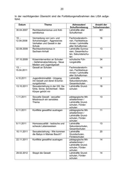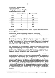 19 • Umgang mit sexueller Gewalt, • Sexualerziehung, • Umgang mit sexuellen Übergriffen, • Fallbesprechung zum Thema. Jahr Veranstaltungen Teilnehmerzahl 2007 3 54 2008 10 180 2009 13 234 2010 13 234 2011 16 288 2012 20 360 gesamt 75 1350 Zusätzlich zum Fortbildungsprogramm wurden folgende Informationsveranstal- tungen angeboten: • Umgang mit sexuell übergriffigen Kindern und Jugendlichen, • Jungen als Opfer sexualisierter Gewalt / Teilnehmerzahl: 120 gemeinsam mit 10 der DGfPI . Das Landesjugendamt hat im Ergebnis der Fachveranstaltungen die Broschüre „Umgang mit sexuellen Übergriffen“ - ein Orientierungsleitfaden zum Erkennen, Stoppen und Verhindern im Rahmen der erzieherischen Hilfen - herausgege- ben, die den Jugendhilfeeinrichtungen bis heute kostenfrei zur Verfügung ge- stellt wird und eine große Nachfrage hat. Das Landesinstitut für Schulqualität und Lehrerbildung Sachsen-Anhalt (LISA) bietet regelmäßig Fortbildungsmaßnahmen zum Thema (sexualisierte) Gewalt an. Zum einen wird das Thema inhaltlich spezifisch separat bearbeitet, zum an- deren wird es in Fortbildungsmaßnahmen, die sich beispielsweise der Gewalt- prävention oder dem Umgang mit Gewalt widmen, tangiert. In den Jahren 2007 bis 2012 wurden seitens des LISA insgesamt 37 Fortbil- dungsmaßnahmen für Lehrkräfte, schulische Führungskräfte und pädagogische Mitarbeiterinnen und Mitarbeiter aller Schulformen und für Multiplikatorinnen und Multiplikatoren der regionalen Fortbildung (Fachbetreuer/innen, Fachmode- ratorinnen, Mitglieder von Fachgruppen an Schulen) explizit zu den Themen- schwerpunkten Prävention sexualisierter Gewalt und Gewaltprävention angebo- ten. Davon wurden 21 Fortbildungsmaßnahmen mit insgesamt 683 Teilneh- menden durchgeführt. Es handelte sich hierbei um landesweite und regionale Fortbildungsveranstaltungen, die beispielsweise als Fachtagungen, als einzelne Tagesveranstaltungen oder als mehrtägige Kurse durchgeführt worden sind. 16 Fortbildungsmaßnahmen mussten aufgrund zu geringer Anmeldezahlen ausfallen. 10 Deutsche Gesellschaft für Prävention und Intervention bei Kindesmisshandlung und –vernachlässigung e.V.