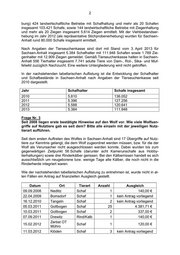 3 Datum Ort Tierart Anzahl Ausgleich Jeber- 27.05.2012 Schaf 1 50,50 € Bergfrieden 25.09.2012 Körbelitz Schaf 4 kein Antrag vorliegend Mieste/ 23.04.2013 Rind/Kalb 1 Antrag in Bearbeitung Breiteiche Jeber- 03.06.2013 Rind/Kalb 1 Antrag in Bearbeitung Bergfrieden Antrag noch nicht vor- 24.07.2013 Vockerode Schaf 8 liegend Antrag noch nicht vor- 26.07.2013 Vockerode Schaf 1 liegend 04.08.2013 Burgstall Schaf 1 kein Antrag vorliegend Antrag noch nicht vor- 05.08.2013 Vockerode Schaf 1 liegend 08.09.2013 Goltewitz Schaf 5 Antrag in Bearbeitung Frage Nr. 4 Wie viele Nutztiere kamen insgesamt zu schaden? Bitte nach Tierart untertei- len. In welcher Höhe belief sich der jeweilige Schaden? Auf die Beantwortung der Frage 3 wird verwiesen. Frage Nr. 5 Wie viele der genannten Risse wurden (finanziell) entschädigt? In welchem Umfang wurde entschädigt? Auf die Beantwortung der Frage 3 wird verwiesen. Frage Nr. 6 Unter welchen Voraussetzungen findet eine Entschädigung statt? Die Bewertung der Anträge auf finanziellen Ausgleich der Nutztierrisse wird vom Landesverwaltungsamt vorgenommen. Grundlage hierfür ist das jeweils detailliert aufzunehmende Rissprotokoll. Es wird davon ausgegangen, dass innerhalb des Territoriums ansässiger Wölfe (dar- gestellt durch eine aktuell gehaltene Gebietskulisse) die Wahrscheinlichkeit eines Wolfsübergriffes wesentlich höher ist als außerhalb. Daher erfolgt ein finanzieller Ausgleich für Nutztierrisse innerhalb dieser Gebietskulisse, wenn der Wolf als Verur- sacher nicht ausgeschlossen werden kann. Außerhalb dieses Bereiches ist ein Nach- weis des Wolfes als Verursacher zu erbringen. Darüber hinaus sollte spätestens ein Jahr nach Bekanntwerden einer territorialen Ansiedlung ein präventiver Mindestschutz realisiert sein. Dieser Mindestschutz ist sowohl in Amtsblättern des Landesverwaltungsamtes und der Landkreise als auch in den einschlägigen Publikationen dargestellt.