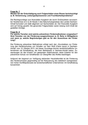 4 Frage Nr. 7 Werden bei der Entschädigung auch Folgeschäden eines Risses berücksichtigt (z. B. Verlammung, Leistungsdepressionen und Fruchtbarkeitsprobleme)? Die Rechtsgrundlage zum finanziellen Ausgleich der durch Großraubtiere verursach- ten Nutztierrisse ist in § 30 Absatz 3 des Naturschutzgesetzes des Landes Sachsen- Anhalt formuliert und stellt allgemein auf Sachschäden ab. Der finanzielle Ausgleich wird auf Antrag gezahlt. Die genannten Folgeschäden waren bislang nicht Inhalt der gestellten Anträge. Frage Nr. 8 Für welche Tierarten sind welche präventiven Fördermaßnahmen vorgesehen? Sind Tierarten von der Förderung ausgeschlossen (z. B. Rehe in Wildgattern) und wenn ja, welche Begründungen gibt es für den Ausschluss der Förde- rung? Die Förderung präventiver Maßnahmen erfolgt nach den „Grundsätzen zur Förde- rung des Herdenschutzes von Schafen vor dem Wolf (Canis lupus) in Sachsen- Anhalt“ vom 10. Oktober 2013. Auf dieser Grundlage können landwirtschaftliche Un- ternehmen mit Schafhaltung, die ihren Betriebssitz in Sachsen-Anhalt haben, Zu- wendungen für den Erwerb von geeigneten Elektrozäunen nebst Zubehör für den präventiven Schutz von Schafherden vor Übergriffen des Wolfes beantragen. Aufgrund der begrenzt zur Verfügung stehenden Haushaltsmittel ist die Förderung des Herdenschutzes gegenwärtig auf die Reduzierung des statistisch nachgewiese- nen hohen Konfliktpotenzials bei landwirtschaftlichen Unternehmen mit Schafhaltung konzentriert.