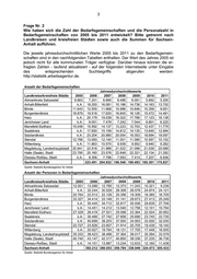3 Frage Nr. 2 Wie haben sich die Zahl der Bedarfsgemeinschaften und die Personalzahl in Bedarfsgemeinschaften von 2005 bis 2011 entwickelt? Bitte getrennt nach Landkreisen und kreisfreien Städten sowie auch die Summen für Sachsen- Anhalt aufführen. Die jeweils jahresdurchschnittlichen Werte 2005 bis 2011 zu den Bedarfsgemein- schaften sind in den nachfolgenden Tabellen enthalten. Der Wert des Jahres 2005 ist jedoch nicht für alle kommunalen Träger verfügbar. Darüber hinaus können die er- fragten Zahlen - laufend aktualisiert - auf der folgenden Internetseite unter Eingabe des entsprechenden Suchbegriffs abgerufen werden: http://statistik.arbeitsagentur.de. Anzahl der Bedarfsgemeinschaften Jahresdurchschnittswerte Landkreise/kreisfreie Städte 2005 2006 2007 2008 2009 2010 2011 Altmarkkreis Salzwedel 6.663 7.201 6.690 6.488 6.091 5.692 5.200 Anhalt-Bitterfeld k.A. 18.200 16.081 15.186 14.736 14.163 13.702 Börde 11.643 12.555 11.668 10.986 10.646 10.359 9.651 Burgenlandkreis 18.879 19.518 17.620 16.845 16.126 15.472 14.481 Harz k.A. 20.179 19.039 18.322 17.786 17.123 16.138 Jerichower Land k.A. 8.051 7.478 7.242 7.044 6.801 6.225 Mansfeld-Südharz 15.046 15.592 14.137 13.223 12.703 12.437 11.779 Saalekreis k.A. 17.650 15.159 14.812 14.135 13.645 12.994 Salzlandkreis k.A. 23.204 20.985 20.054 19.353 18.694 18.097 Stendal 12.766 13.093 12.140 11.501 11.090 10.597 10.102 Wittenberg k.A. 11.863 10.575 9.939 9.952 9.940 9.262 Magdeburg, Landeshauptstadt 20.941 22.918 21.989 21.522 21.099 21.039 20.089 Halle (Saale), Stadt 23.795 25.160 23.576 22.848 22.321 22.134 21.282 Dessau-Roßlau, Stadt k.A. 8.306 7.796 7.583 7.414 7.207 6.836 Sachsen-Anhalt 223.491 204.932 196.548 190.493 185.301 175.837 Quelle: Statistik Bundesagentur für Arbeit Anzahl der Personen in Bedarfsgemeinschaften Jahresdurchschnittswerte Landkreise/kreisfreie Städte 2005 2006 2007 2008 2009 2010 2011 Altmarkkreis Salzwedel 12.001 13.088 12.795 12.373 11.243 10.321 9.236 Anhalt-Bitterfeld k.A. 32.244 30.529 28.308 26.578 24.974 24.121 Börde 20.764 22.513 22.128 20.356 19.309 18.385 16.705 Burgenlandkreis 33.327 34.414 33.149 31.141 28.673 27.413 25.249 Harz k.A. 35.445 34.712 32.817 30.936 29.839 27.706 Jerichower Land k.A. 14.451 14.212 13.540 12.758 12.101 10.794 Mansfeld-Südharz 27.329 28.419 27.521 25.098 23.364 22.524 20.952 Saalekreis k.A. 30.466 27.742 27.658 25.690 23.740 22.735 Salzlandkreis k.A. 40.699 39.203 37.000 34.953 33.500 32.035 Stendal 22.727 23.826 23.607 21.914 20.705 19.439 18.140 Wittenberg k.A. 20.927 19.764 18.131 17.755 17.448 16.005 Magdeburg, Landeshauptstadt 35.333 38.423 38.488 37.364 36.017 35.394 33.579 Halle (Saale), Stadt 40.740 43.147 42.317 40.850 38.336 37.235 36.736 Dessau-Roßlau, Stadt k.A. 14.151 13.887 13.234 12.633 12.160 11.438 Sachsen-Anhalt 392.212 380.053 359.784 338.949 324.473 305.433 Quelle: Statistik Bundesagentur für Arbeit