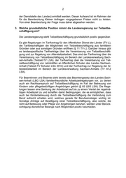 2 der Dienststelle des Landes) ermittelt werden. Dieser Aufwand ist im Rahmen der für die Beantwortung Kleiner Anfragen vorgegebenen Fristen nicht zu leisten. Von einer Beantwortung der Frage muss daher abgesehen werden. 3. Welche grundsätzliche Position nimmt die Landesregierung zur Teilzeitbe- schäftigung ein? Die Landesregierung steht Teilzeitbeschäftigung grundsätzlich positiv gegenüber. Es gibt Regelungen im Tarifvertrag für den öffentlichen Dienst der Länder (TV-L), die Tarifbeschäftigten die Möglichkeit von Teilzeitbeschäftigung aus familiären Gründen oder aus sonstigen Gründen eröffnen (§ 11 TV-L). Darüber hinaus gibt es landesspezifische Tarifverträge über die Vereinbarung von Teilzeitbeschäfti- gung und zur Regelung von Altersteilzeitarbeit. Das sind der Tarifvertrag über die Vereinbarung von Teilzeitbeschäftigung im Bereich der Landesverwaltung Sach- sen-Anhalts (Teilzeit-TV LSA), der Tarifvertrag über die Vereinbarung von Teil- zeitbeschäftigung von Lehrkräften an öffentlichen Schulen des Landes Sachsen- Anhalt (Teilzeit-TV Schulen LSA 2014) und der Tarifvertrag zur Regelung der Al- tersteilzeitarbeit im Bereich der Landesverwaltung Sachsen-Anhalts (TV ATZ LSA). Für Beamtinnen und Beamte sieht bereits das Beamtengesetz des Landes Sach- sen-Anhalt (LBG LSA) familienfreundliche Arbeitszeitregelungen vor, zu denen auch ein Rechtsanspruch auf Teilzeitbeschäftigung im Fall der Betreuung von Kindern oder pflegebedürftigen Angehörigen gehört (§ 65 LBG LSA). Die Rege- lungen lassen eine Senkung der Arbeitszeit auf bis zu einem Viertel der regelmä- ßigen Arbeitszeit zu und schaffen damit Bedingungen, die es ermöglichen, dass auch bei Kinderbetreuung durch die Teilzeitbeschäftigung die Verbindung zum Beruf aufrecht erhalten wird, welches gerade für Berufseinsteiger wichtig ist. Sonstige Anträge auf Bewilligung einer Teilzeitbeschäftigung, also solche, die nicht auf Betreuung oder Pflege von Angehörigen beruhen, werden unter Berück- sichtigung dienstlicher Belange nach Möglichkeit positiv beschieden.