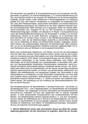 2 Die Gemeinden sind gemäß § 39 Europawahlordnung für die Europawahl, der Bür- germeister ist gemäß § 16 Kommunalwahlgesetz, § 13 Kommunalwahlordnung für das Land Sachsen-Anhalt für die Auswahl von Wahlräumen für die Kommunalwahlen zuständig. Soweit möglich, sollen Wahlräume in Gemeindegebäuden zur Verfügung gestellt und nach den örtlichen Verhältnissen so ausgewählt und eingerichtet wer- den, dass allen Wahlberechtigten, insbesondere behinderten und anderen Menschen mit Mobilitätsbeeinträchtigung, die Teilnahme an der Wahl möglichst erleichtert wird. Die Gemeindebehörden teilen frühzeitig und in geeigneter Weise mit, welche Wahl- räume barrierefrei sind. Vorgaben für die von den Gemeinden zu versendenden Wahlbenachrichtigungen enthalten zum Beispiel § 18 Absatz 1 Europawahlordnung sowie die Musterwahlbenachrichtigung für die Europawahl in Anlage 3 zur Europa- wahlordnung. Danach ist für jeden Wahlraum anzugeben, ob er barrierefrei oder nicht barrierefrei ist. Darüber hinaus müssen in der Wahlbenachrichtigung die Tele- fonnummern, unter der die Wahlberechtigten Auskünfte zu barrierefreien Wahlräu- men und zu Hilfsmitteln für Blinde und Sehbehinderte erhalten, angegeben werden. Damit können alle wahlberechtigten Menschen mit Behinderungen selbst entschei- den, ob sie ein behindertengerechtes Wahllokal aufsuchen (gegebenenfalls mit ei- nem Wahlschein) oder per Briefwahl an der Europawahl teilnehmen. Blinde oder sehbehinderte Wählerinnen und Wähler, die sich bei der Stimmabgabe nicht der Hilfe einer anderen Person bedienen wollen, können sich bei der Europa- wahl zur Kennzeichnung des Stimmzettels auch einer Stimmzettelschablone (Wahl- schablone) bedienen (§ 50 Absatz 4 Europawahlordnung); bei den Wahlen zu den kommunalen Vertretungen ist der Einsatz dieses Hilfsmittels nicht möglich. Die Stimmzettel, die für die Europawahl vom Landeswahlleiter zu beschaffen sind, sollen den vom Bundeswahlleiter empfohlenen Standardmaßen entsprechen, damit bun- desweit einheitliche Stimmzettelschablonen hergestellt werden können. Die Stimm- zettel sollen daher durch ein eingestanztes Loch am oberen rechten Rand landesweit identisch gekennzeichnet werden, um blinden und sehbehinderten Wählerinnen und Wählern das selbstbestimmte und passgenaue Einlegen des Stimmzettels in eine Wahlschablone zu ermöglichen und den Stimmzettel unbeobachtet und ohne Hilfe einer anderen Person auszufüllen. Wahlschablonen werden vom Blinden- und Seh- behinderten-Verband Sachsen-Anhalt e. V. verteilt und können dort kostenfrei ange- fordert werden. Die Herstellung und die Verteilung der Stimmzettelschablonen wer- den vom Bund finanziert. Das Kompetenzzentrum für Barrierefreiheit in Sachsen-Anhalt wird - wie bereits zur Bundestagswahl 2013 - eine Fragebogenaktion zur Barrierefreiheit der Europawahl 2014 durchführen. Der Fragebogen ist auf der Internetseite des Kompetenzzentrums (www.kb-sa.de) eingestellt und kann dort abgefordert oder im Internet ausgefüllt werden. In einer gemeinsamen Pressekonferenz des Landeswahlleiters mit dem Blinden- und Sehbehinderten-Verband Sachsen-Anhalt e. V. und dem Kompetenz- zentrum werden der Öffentlichkeit am 6. Mai 2014 die Wahlschablonen und der Fra- gebogen zur Barrierefreiheit für die Europawahl vorgestellt. Darüber hinaus werden Hinweise für Wählerinnen und Wähler mit Mobilitätseinschränkungen, Sinnesbehin- derung und kognitiven Einschränkungen gegeben. 3. Welche Maßnahmen waren oder sind darüber hinaus aus Sicht der Landes- regierung gemeinsam mit den Kommunen zu ergreifen, damit bis zur Europa-