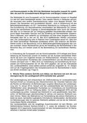 Landtag von Sachsen-Anhalt Drucksache 6/3069 09.05.2014 Antwort der Landesregierung auf eine Kleine Anfrage zur schrift- lichen Beantwortung Abgeordnete Dagmar Zoschke (DIE LINKE) Barrierefreie Zugänglichkeit der Wahllokale in Sachsen-Anhalt Kleine Anfrage - KA 6/8296 Antwort der Landesregierung erstellt vom Ministerium für Inneres und Sport 1. Wie viele Wahllokale sind nach Kenntnis der Landesregierung zur Bundes- tagswahl im September 2013 eingerichtet worden und wie viele waren für mobi- litätseingeschränkte Bürgerinnen und Bürger barrierefrei zugänglich? In Sachsen-Anhalt waren zur Bundestagswahl am 22. September 2013 insgesamt 2 316 Wahllokale eingerichtet. Die Anzahl der für mobilitätseingeschränkte Bürgerin- nen und Bürger barrierefrei zugänglichen Wahllokale ist der Landesregierung grund- sätzlich nicht bekannt. Nach Angaben der Kreiswahlleiter für die Bundestagswahl gegenüber dem Landeswahlleiter des Landes Sachsen-Anhalt waren 1 032 Wahllo- kale, also fast 45 % der landesweit eingerichteten Wahllokale, barrierefrei. 2. Mit welchen Maßnahmen (Informationen, Investitionshilfen oder Sonstiges) hat die Landesregierung sichergestellt bzw. wird die Landesregierung sicher- stellen, dass zur Europa- und Kommunalwahl im Mai 2014 alle wahlberechtig- ten Menschen mit Behinderungen in Sachsen-Anhalt ihr Wahlrecht möglichst ohne fremde Hilfe am Wahltag wahrnehmen können? Die Landesregierung hat im Rahmen der vom Landeswahlleiter nach dem Europa- wahlgesetz und der Europawahlordnung durchzuführenden Europawahl keine Zu- ständigkeiten. Bei den Wahlen zu den kommunalen Vertretungen nimmt der Lan- deswahlleiter zentrale Wahlaufgaben gemäß § 14 Kommunalwahlgesetz des Landes Sachsen-Anhalt wahr; das für Wahlen zuständige Ministerium für Inneres und Sport ist als Verordnungsgeber und als oberste Kommunalaufsichtsbehörde zuständig. Die Beantwortung der Fragen 2 bis 4 erfolgt daher im Einvernehmen mit dem Landes- wahlleiter des Landes Sachsen-Anhalt. (Ausgegeben am 13.05.2014)